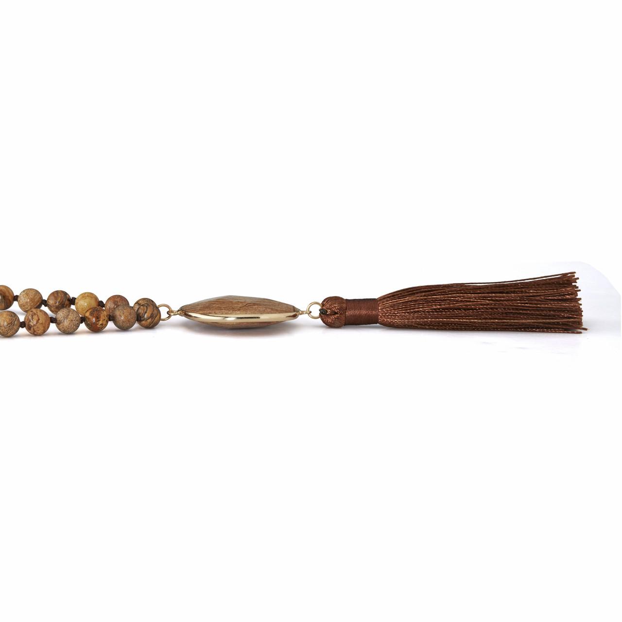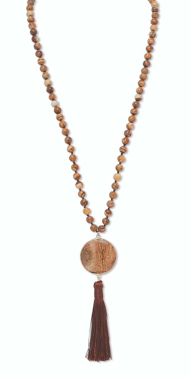 Genuine brown jasper tassel drop necklace measuring 34 inches in length. This eye catching design features polished jasper beads accented by a goldtone bezel set cabochon centerpiece with tassel detail. The warm earthy tones make it a versatile statement piece for casual or dress wear. Because these are genuine jasper stones, natural variations in color and pattern may occur.