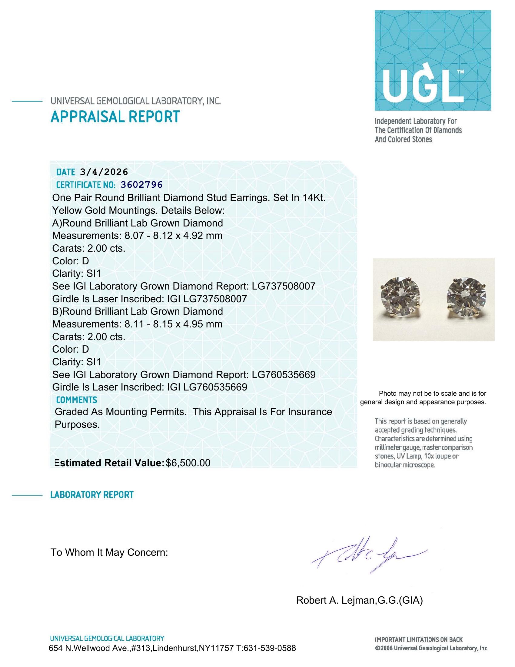 Pair of round brilliant laboratory grown diamond stud earrings set in 14kt yellow gold mountings. These classic diamond studs feature large round brilliant cut lab grown diamonds with excellent sparkle and brilliance. The timeless solitaire stud design allows the diamonds to be the focal point and makes them suitable for everyday wear or special occasions. Each diamond is independently certified by IGI and the pair also includes a UGL appraisal report confirming the jewelry details and estimated retail replacement value for insurance purposes.