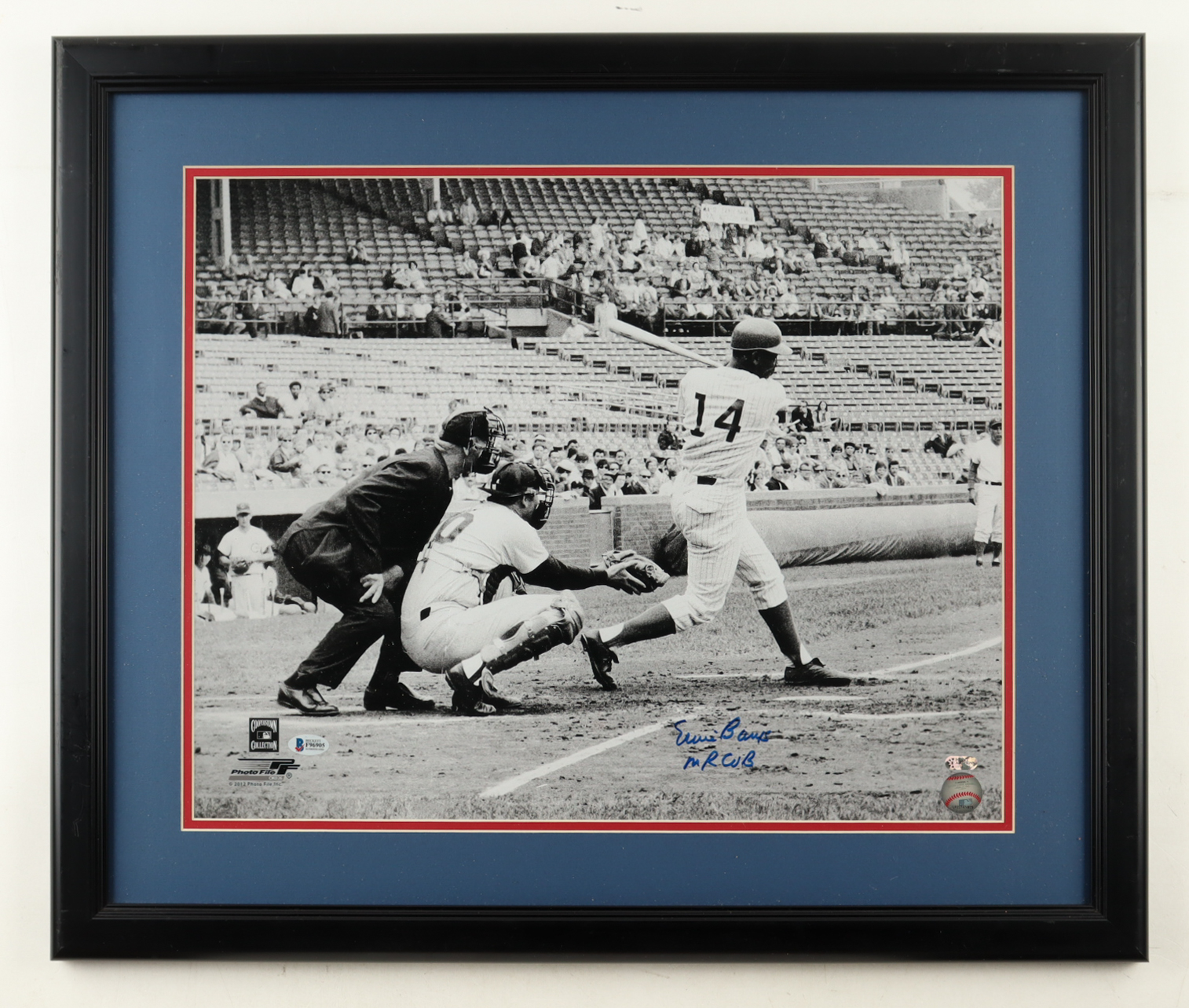 Custom frame measures 22" x 26.5" in size and features a photo that has been hand-signed and inscribed by Ernie Banks (D. 2015, Chicago Cubs, HOF).