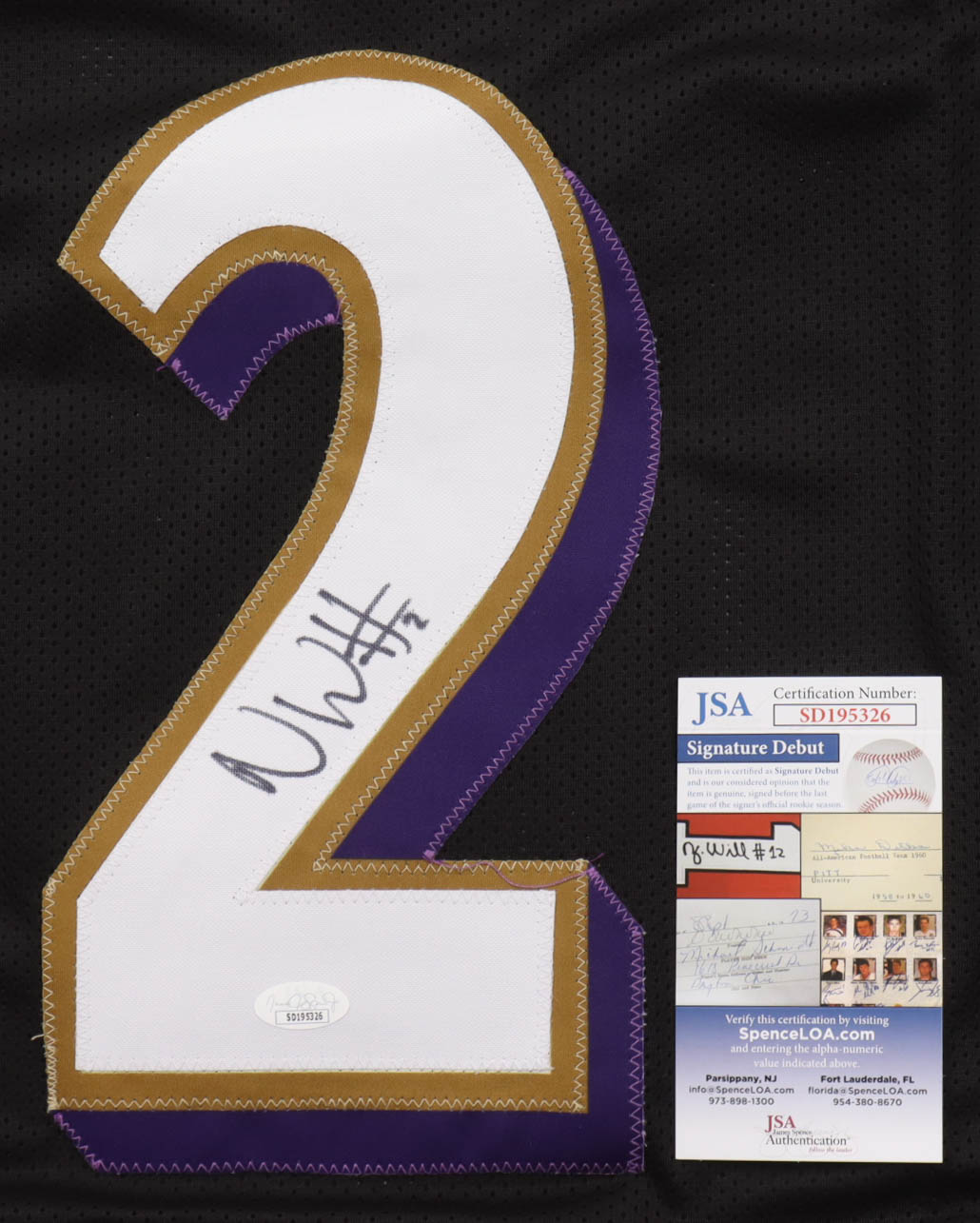 The autograph(s) includes an official James Spence Authentication (JSA) "Signature Debut" hologram and COA. "Signature Debut" is the autographed memorabilia equivalent to a rookie card. The JSA definition of a "Signature Debut" is as follows: "Any item that is autographed and received by JSA prior to the last game of the signer's official rookie season.