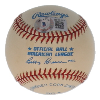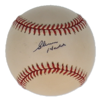 Rawlings Official American League baseball has been hand-signed by Glenn Hall (d. 2026, Chicago Blackhawks, HOF). Please note, the baseball is stained and naturally toned.
