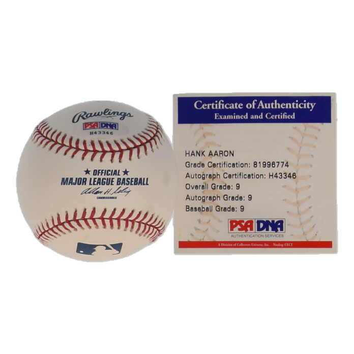 Rawlings Official Major League baseball. Hand-signed by Hank Aaron (D. 2021, Atlanta Braves, HOF). Autograph has been graded (PSA Auto 9). Please note, the baseball is stained throughout and naturally toned.