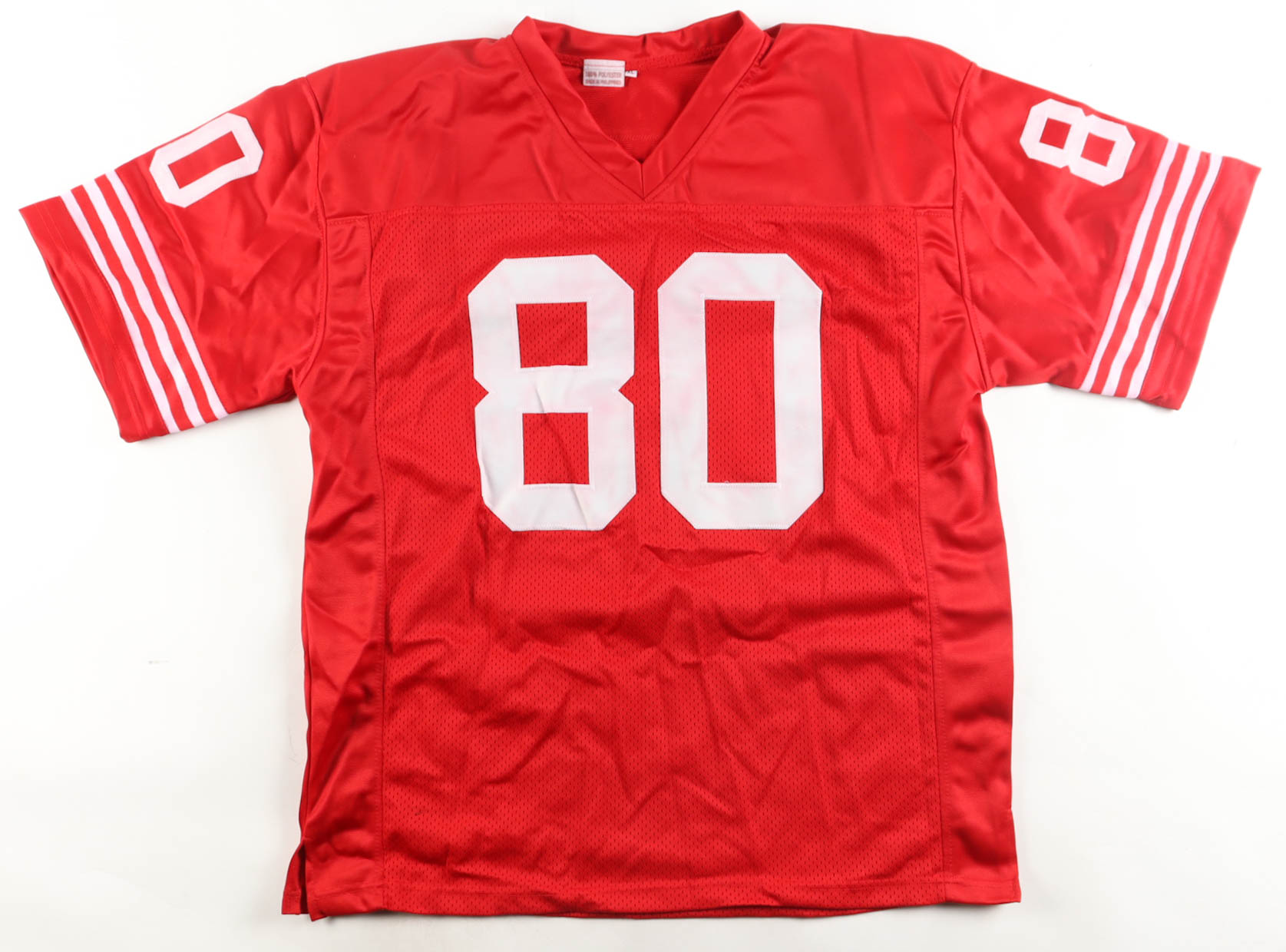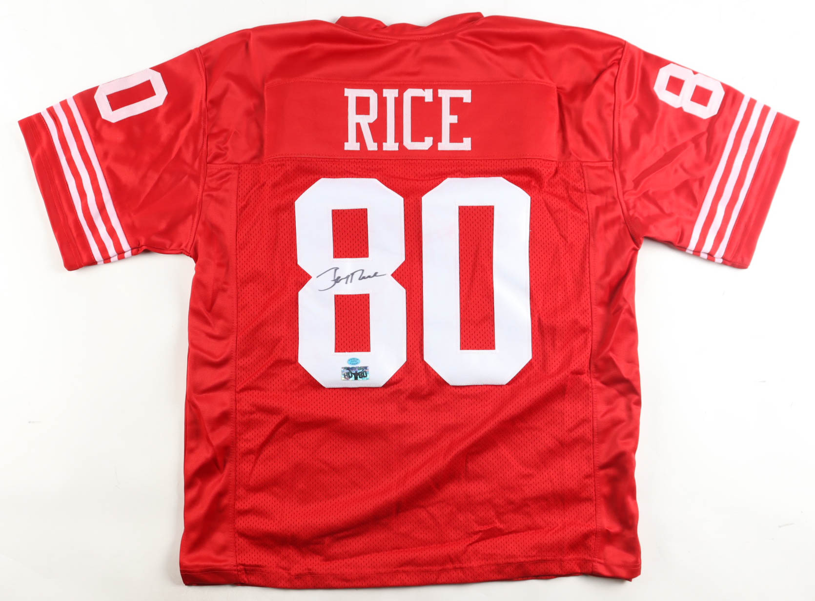 Custom jersey with everything sewn on, size XL. Hand-signed by Jerry Rice (HOF). Please note, glue is visible through the front and reverse numbers.