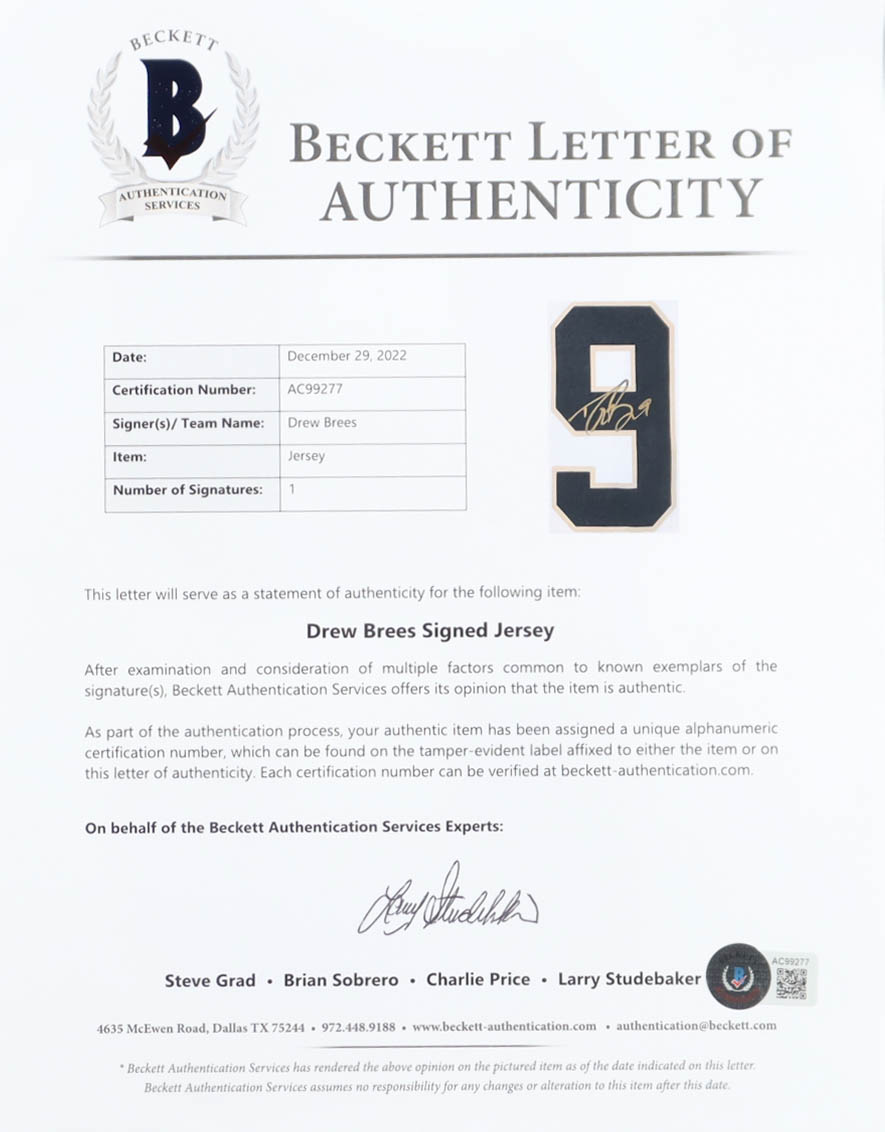 Nike authentic jersey with everything pressed on, size XL. Hand-signed by Drew Brees (New Orleans Saints). Please note, there is minor staining near the reverse number and on the shoulders. See photos regarding the condition of the item.