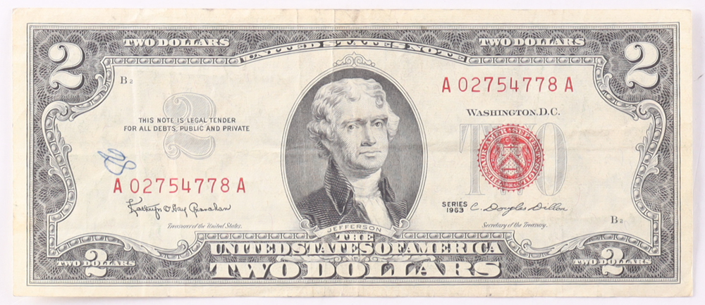 1963 $2 United States Treasury Red Seal Silver Certificate Paper Bank Note
