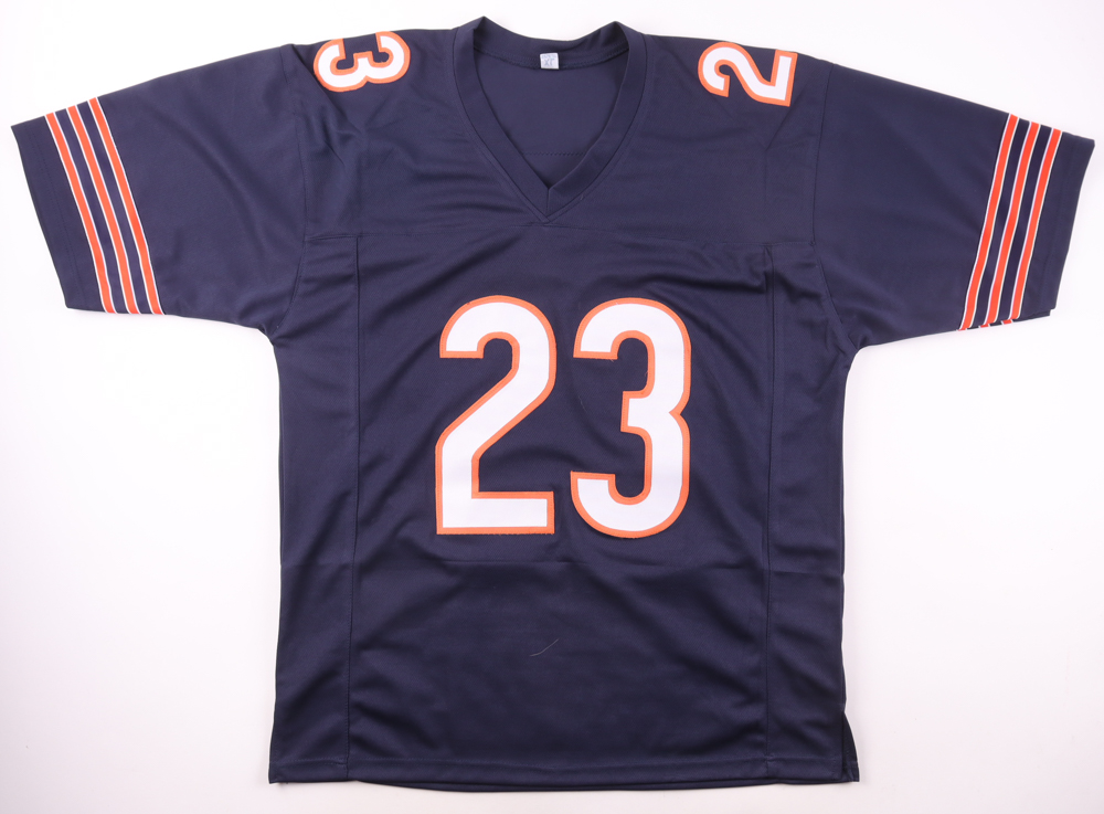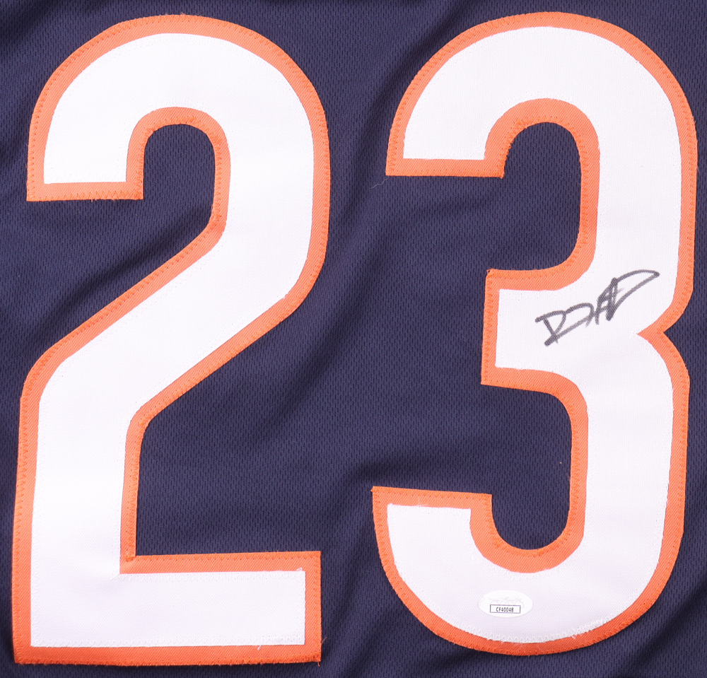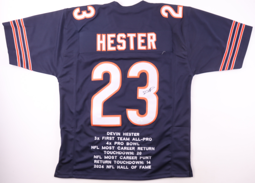 Custom jersey. Everything is sewn on, size XL. Has been hand-signed by Devin Hester. Hester's career highlights have been custom stitched onto the back of the jersey below the reverse numbers.