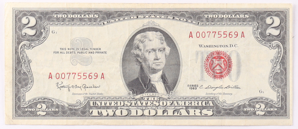 1963 $2 United States Treasury Red Seal Silver Certificate Paper Bank Note