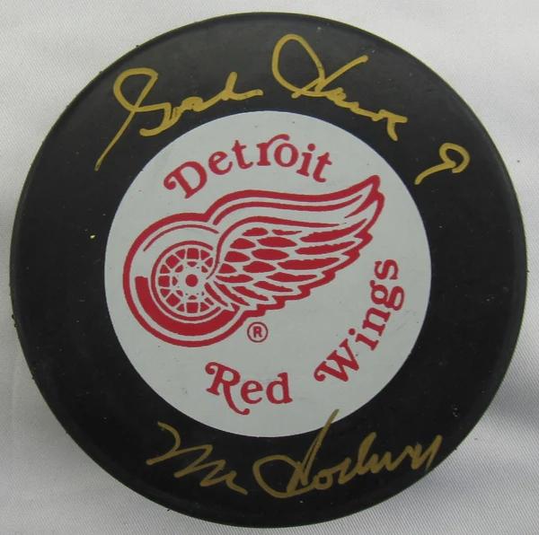 Detroit Red Wings logo hockey puck has been hand-signed and inscribed by Gordie Howe (D. 2016, HOF).
