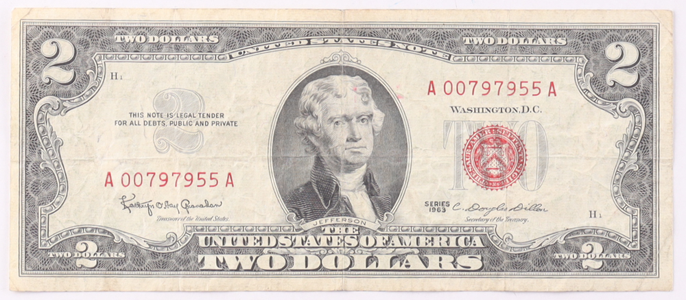 1963 $2 United States Treasury Red Seal Silver Certificate Paper Bank Note