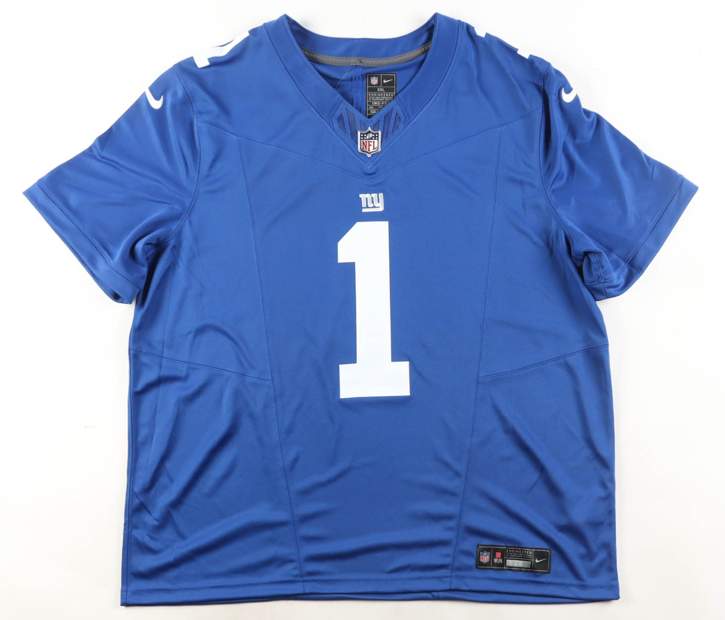 Nike authentic jersey with everything pressed on, size XXL. Hand-signed by Malik Nabers (New York Giants).