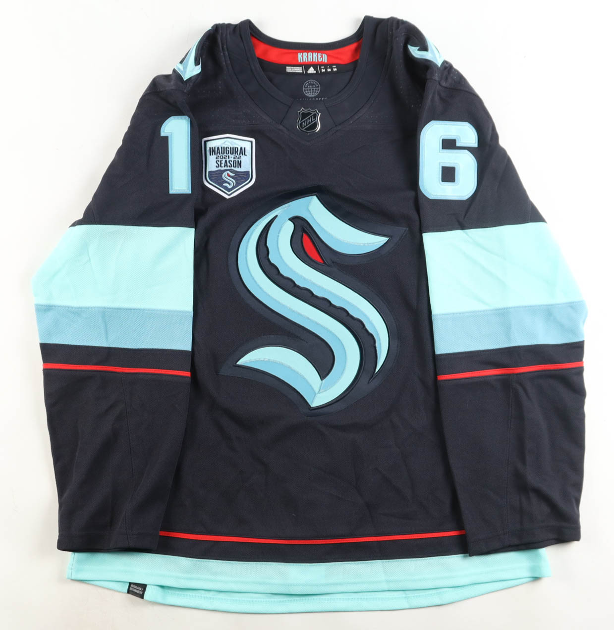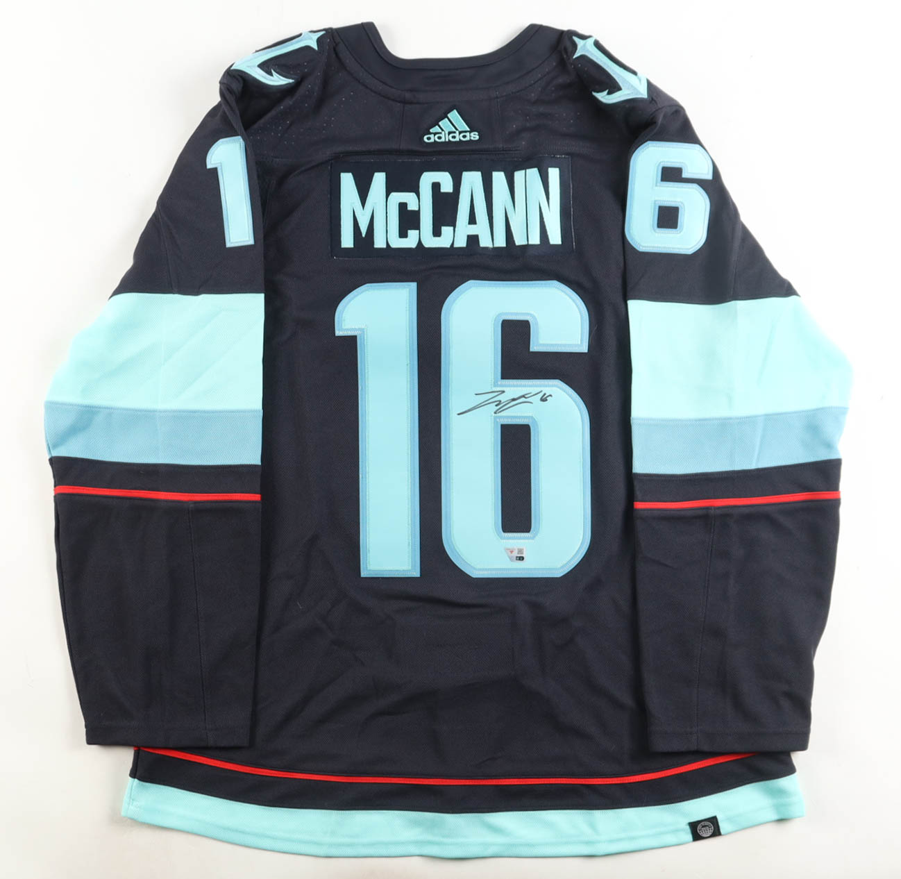 Adidas authentic jersey with everything sewn/pressed on, size 54. Hand-signed by Jared McCann (Seattle Kraken).