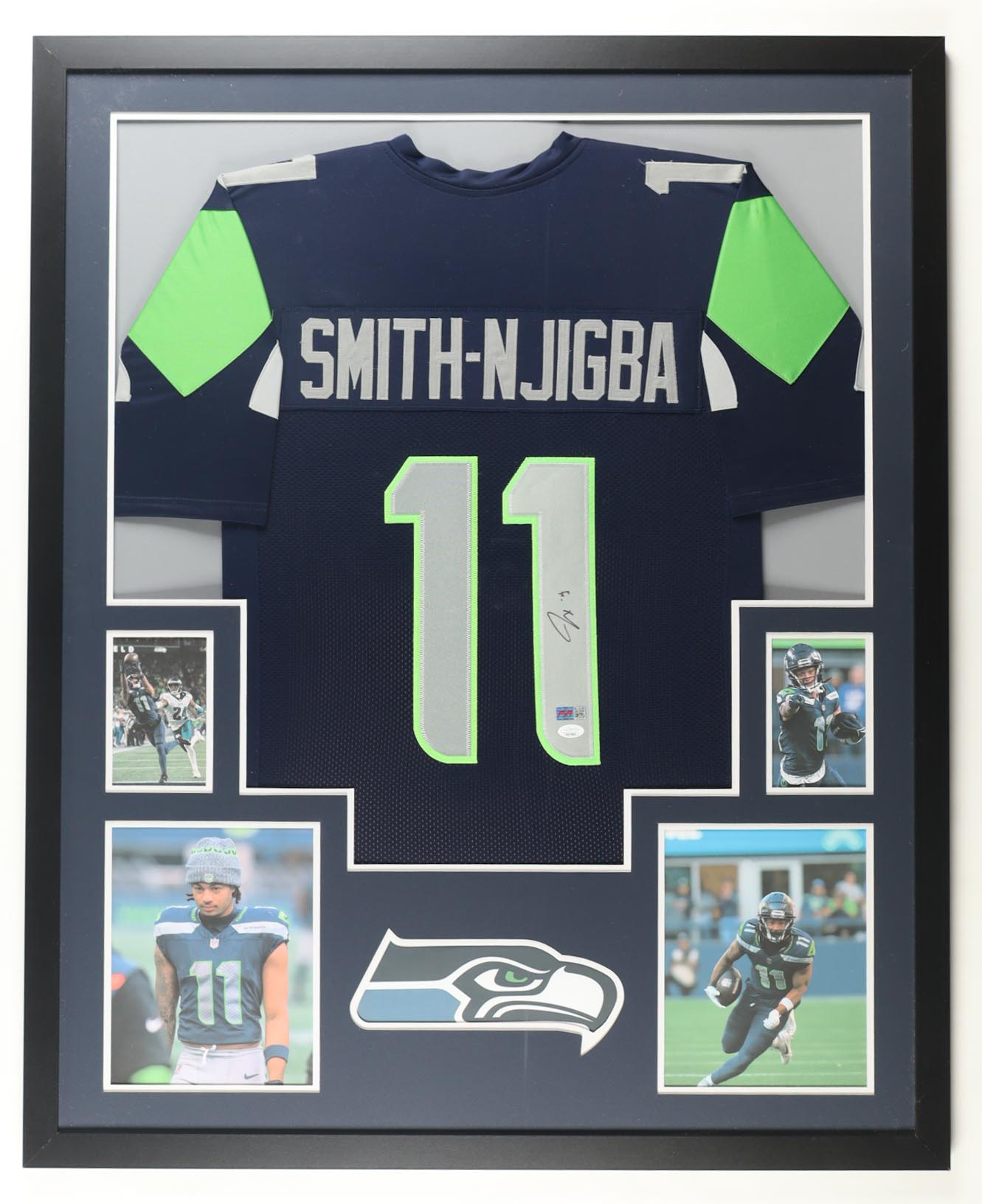 Custom frame measures 34" x 42" in size and features a custom jersey that has been hand-signed by Jaxon Smith-Njigba (Philadelphia Eagles). Please refer to photos regarding the condition of the item.