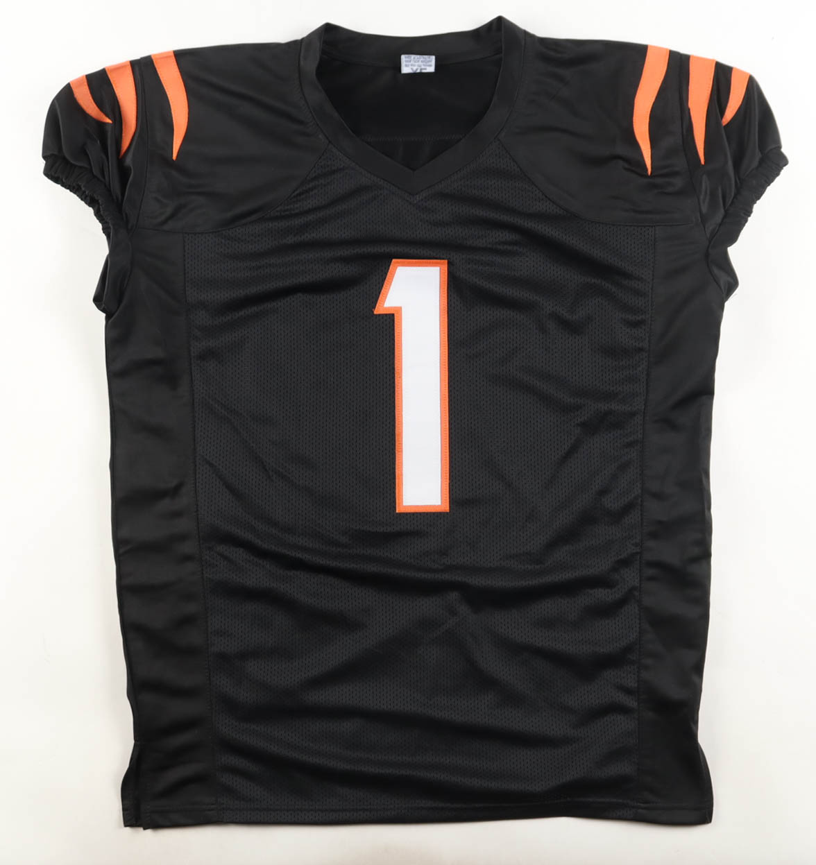Custom jersey with everything sewn on, size XL. Hand-signed by Ja'Marr Chase. Please note, there is a stain on the reverse number. See photos regarding the condition of the item.