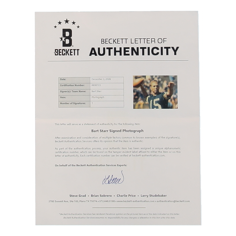 Photo measures approximately 8" x 10" in size and is hand-signed by Bart Starr (D. 2019, Green Bay Packers, HOF).
