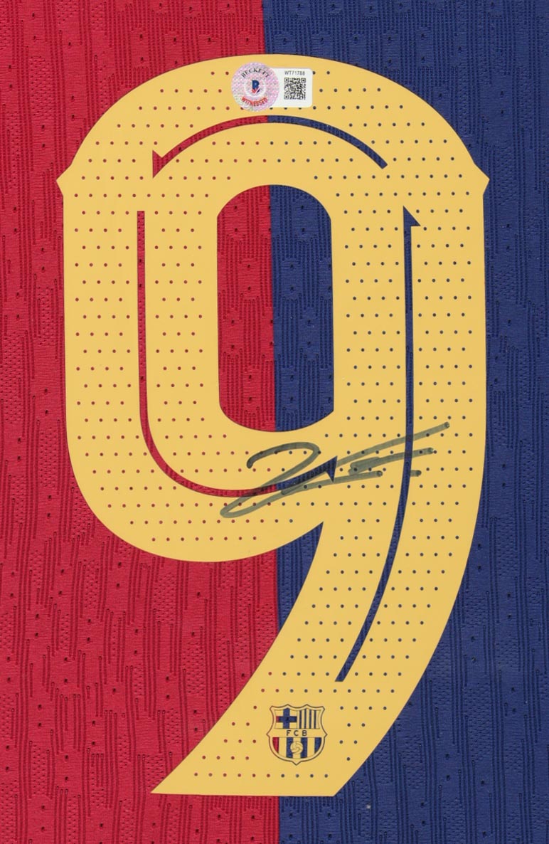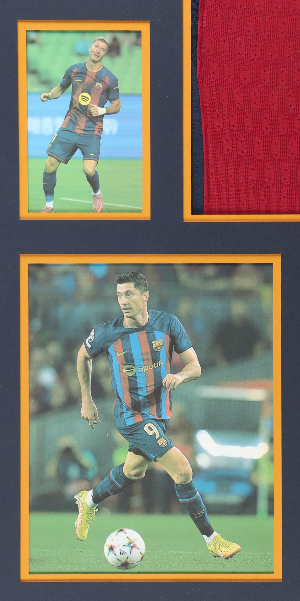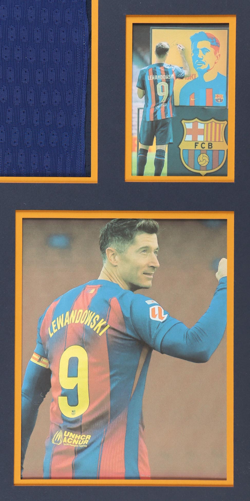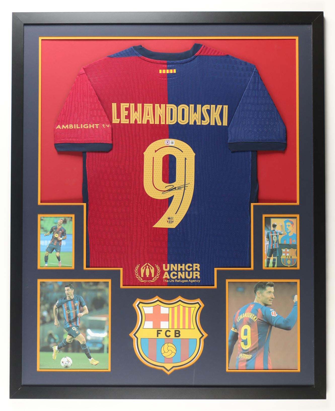 Custom frame measures 34" x 42" in size and features a custom jersey that has been hand-signed by Robert Lewandowski (FC Barcelona). Please refer to photos regarding the condition of the item.