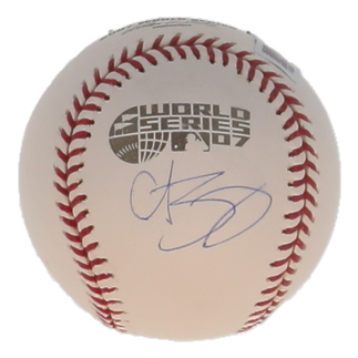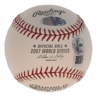 Rawlings Official 2007 World Series Baseball. Hand-signed by Curt Schilling (Boston Red Sox). Please note, there are stains throughout the baseball.