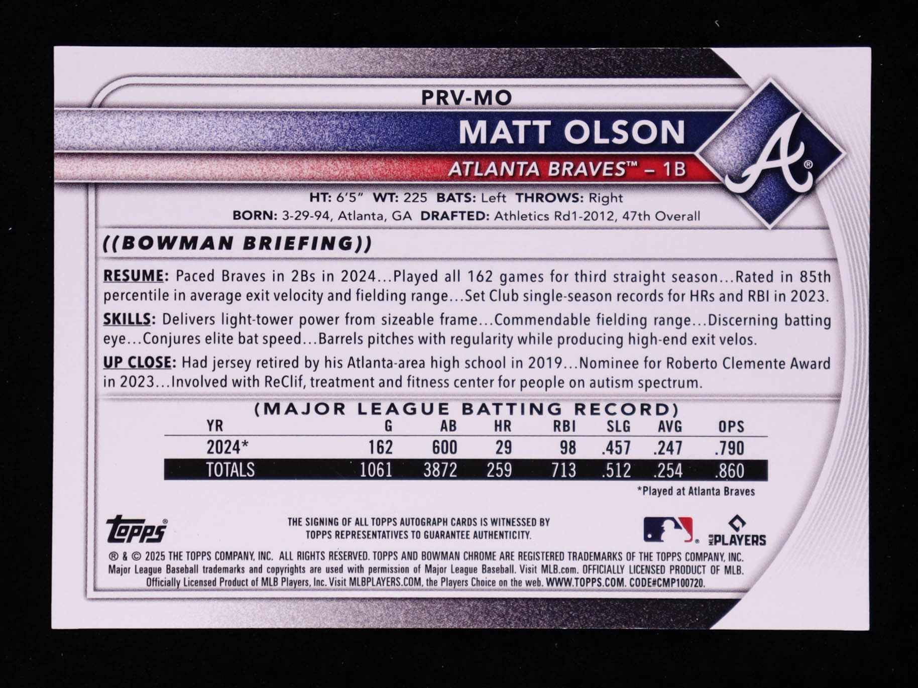 Matt Olson 2025 Bowman Rookie and Veteran Autographs Orange Border #PRVMO #21/25