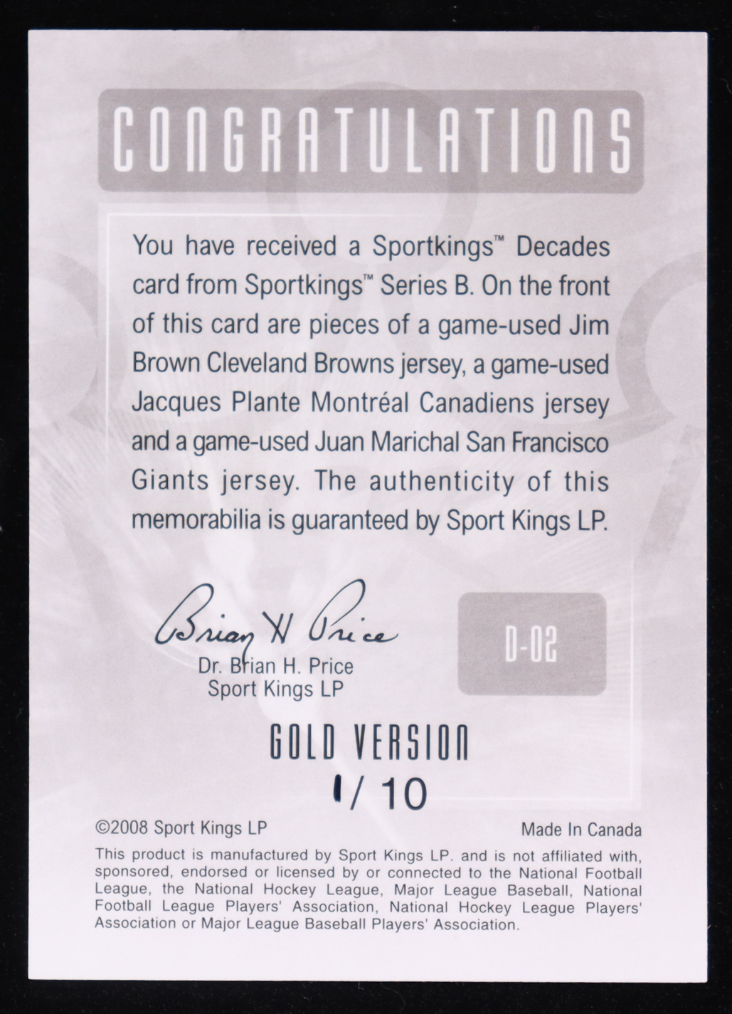 Jim Brown / Jacque Plante / Juan Marichal 2008 Sportkings Decades Gold #2 #01/10