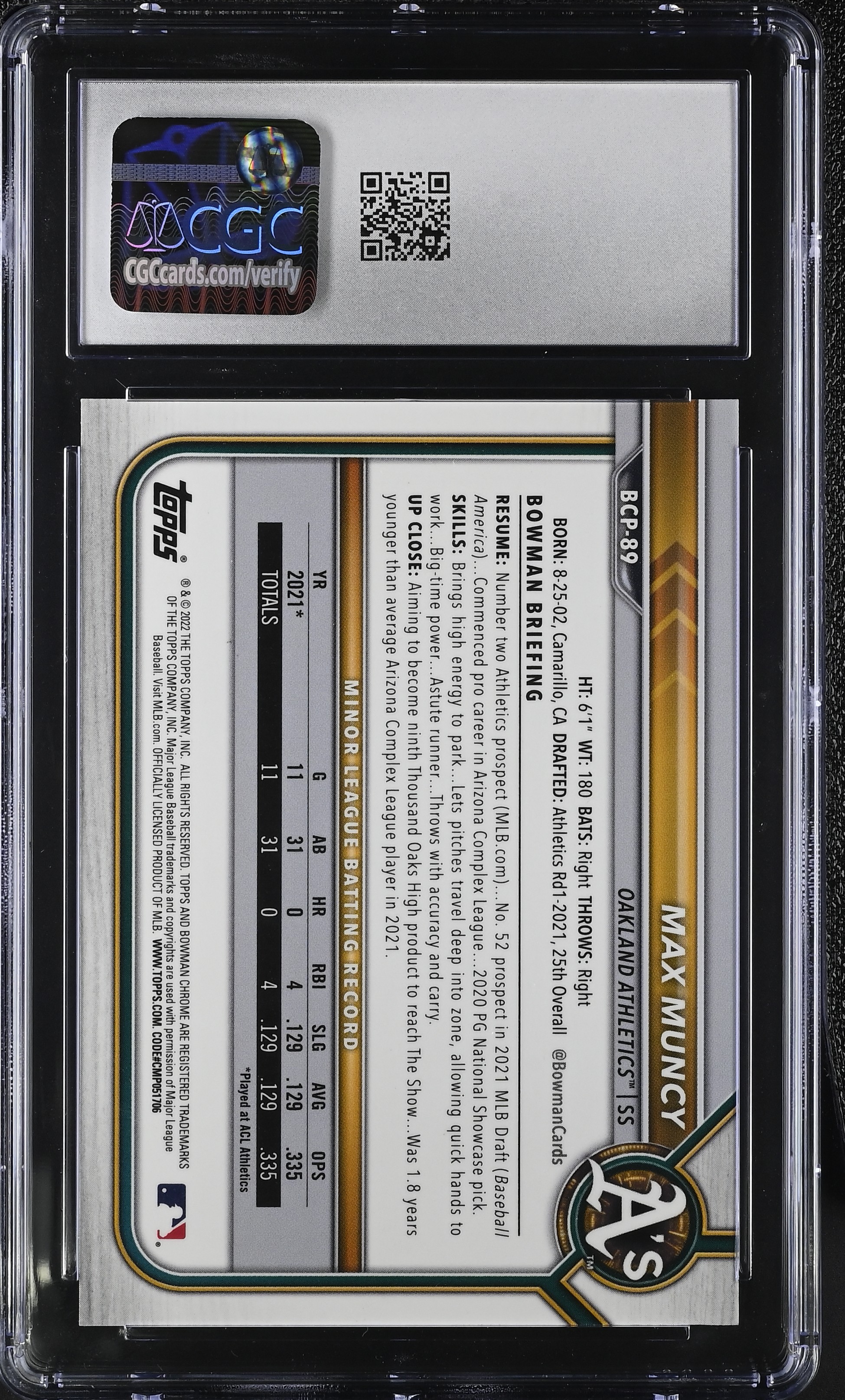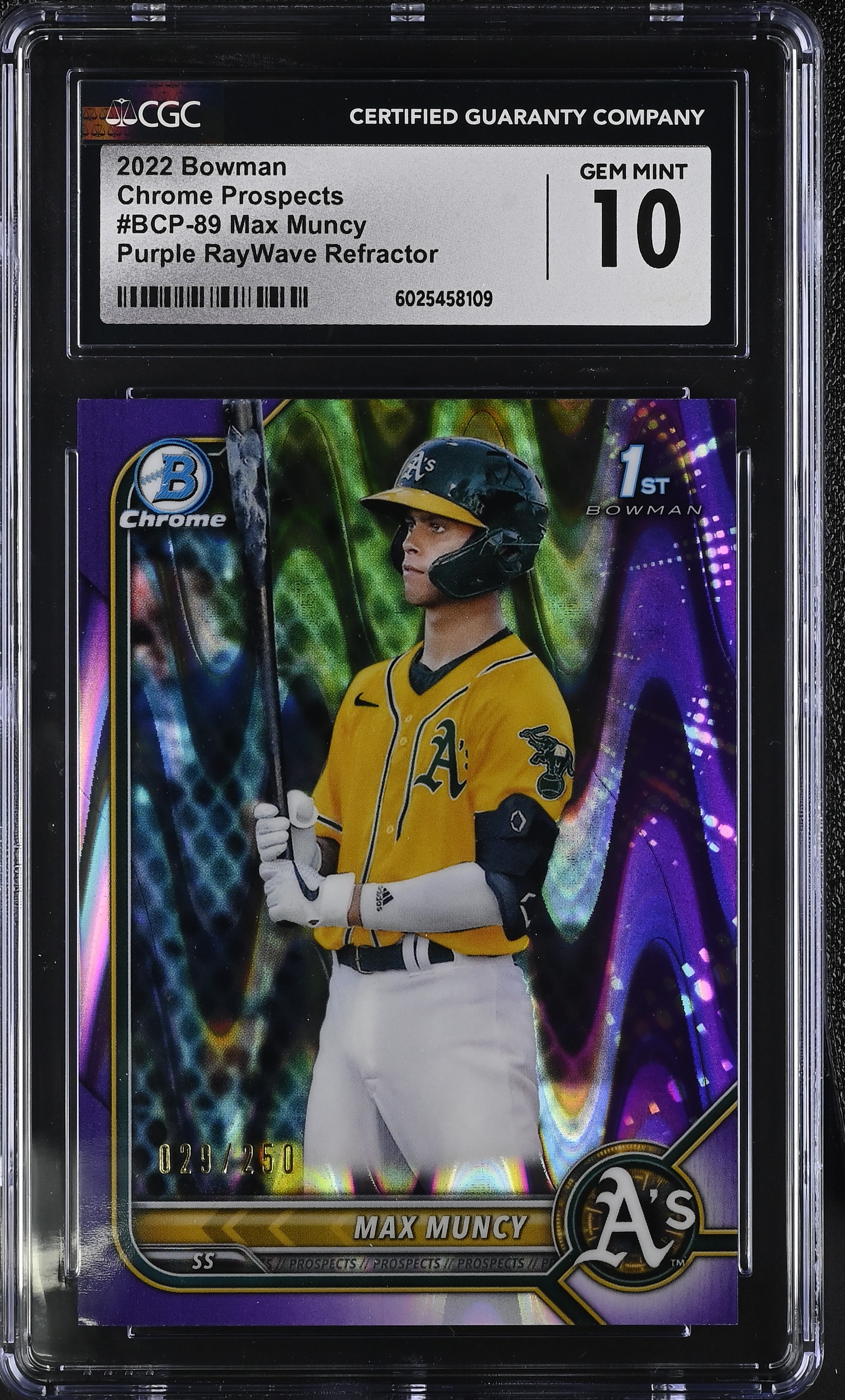 Max Muncy 2022 Bowman Chrome Prospects Purple RayWave Refractors #BCP89 RC #029/250 (CGC 10)