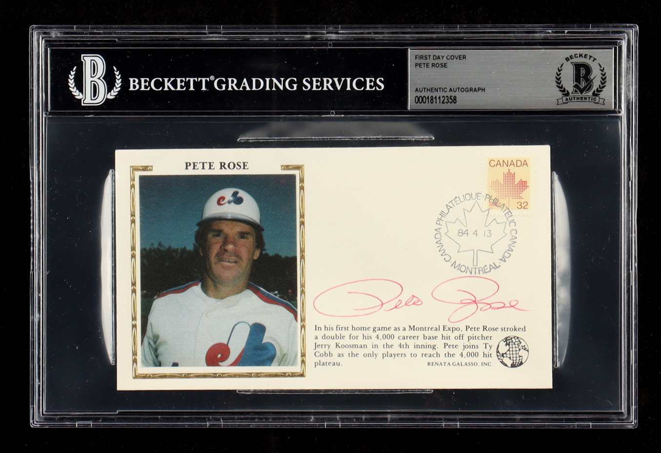 First Day Cover envelope dated April 13, 1984. Hand-signed by Pete Rose (D. 2024, Montreal Expos).
