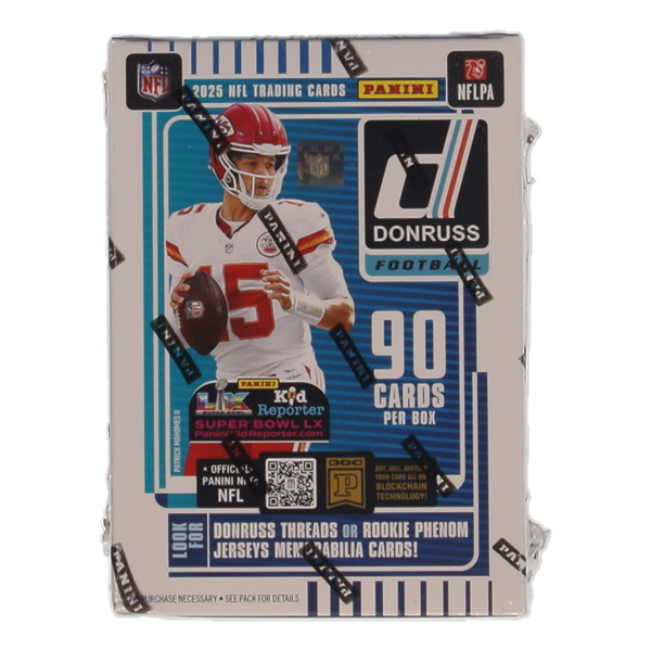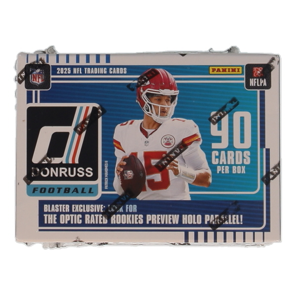 Panini presents the 2025 Donruss Football Trading Card Blaster Box. Each box contains 6 packs with 15 cards per pack. Look for Retail Exclusive Red Hot Rookies! Look for the Ultra-Rare Downtown Inserts! Look for Donruss Threads or Rookie Phenom Jerseys Memorabilia Cards!