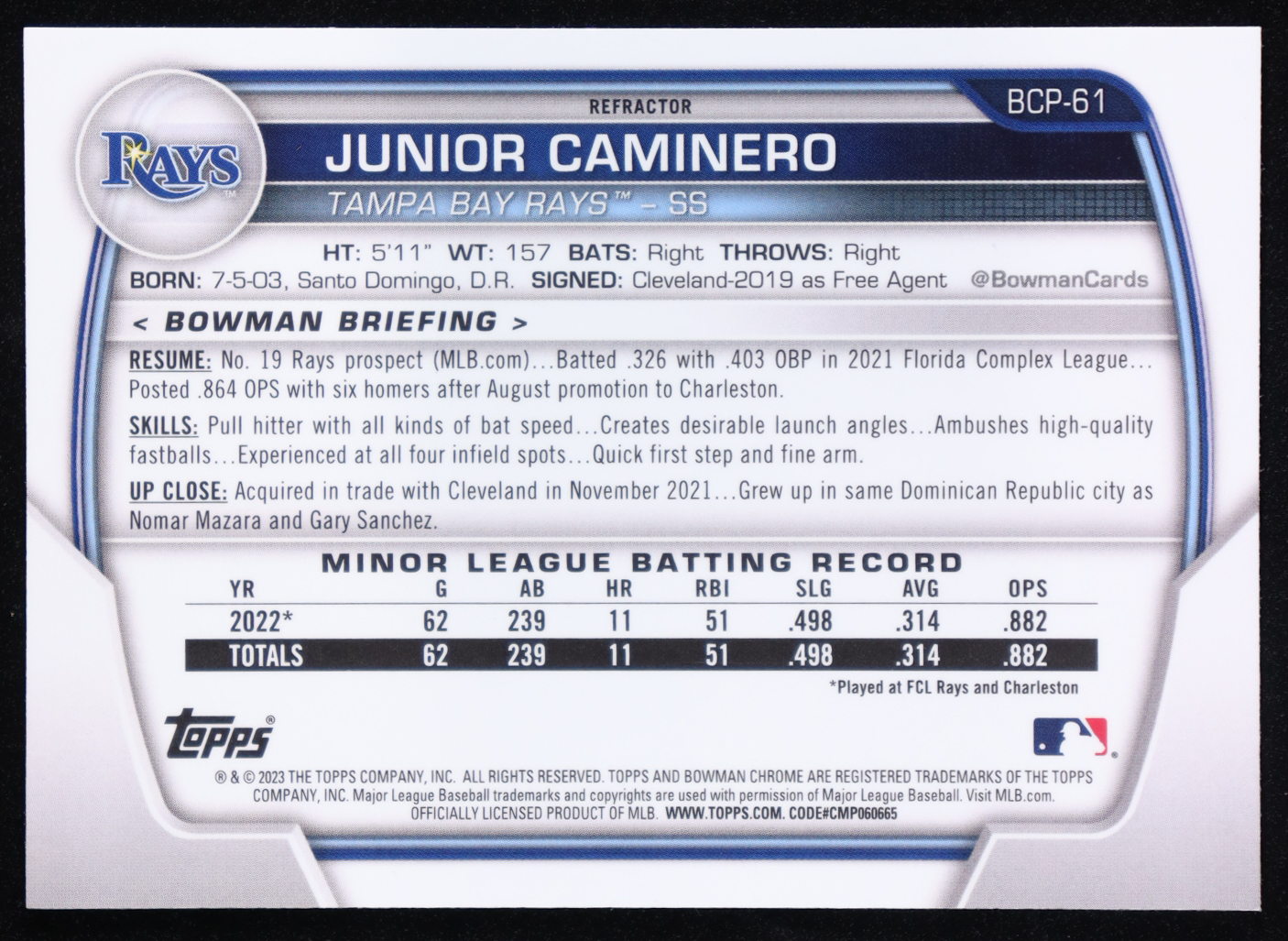 Junior Caminero 2023 Bowman Chrome Prospects Lunar Glow Refractors #BCP61 RC