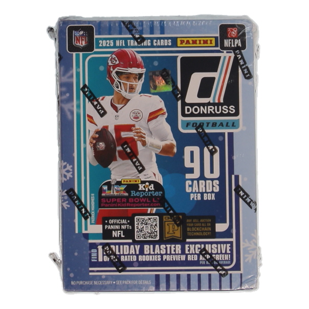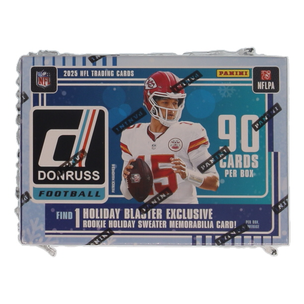 Panini presents the 2025 Donruss Football Holiday Trading Card Blaster Box. Each box contains 6 packs with 15 cards per pack. Look for Retail Exclusive Red Hot Rookies! Look for the Ultra-Rare Downtown Inserts! Look for Donruss Threads or Rookie Phenom Jerseys Memorabilia Cards!