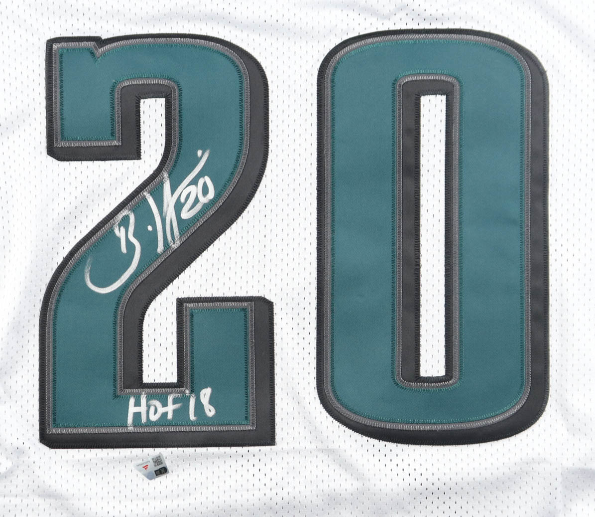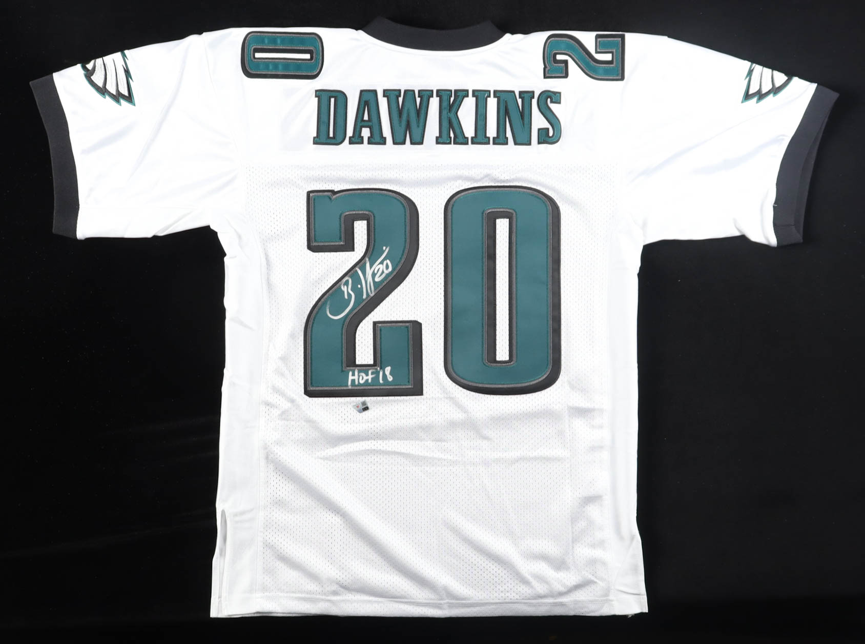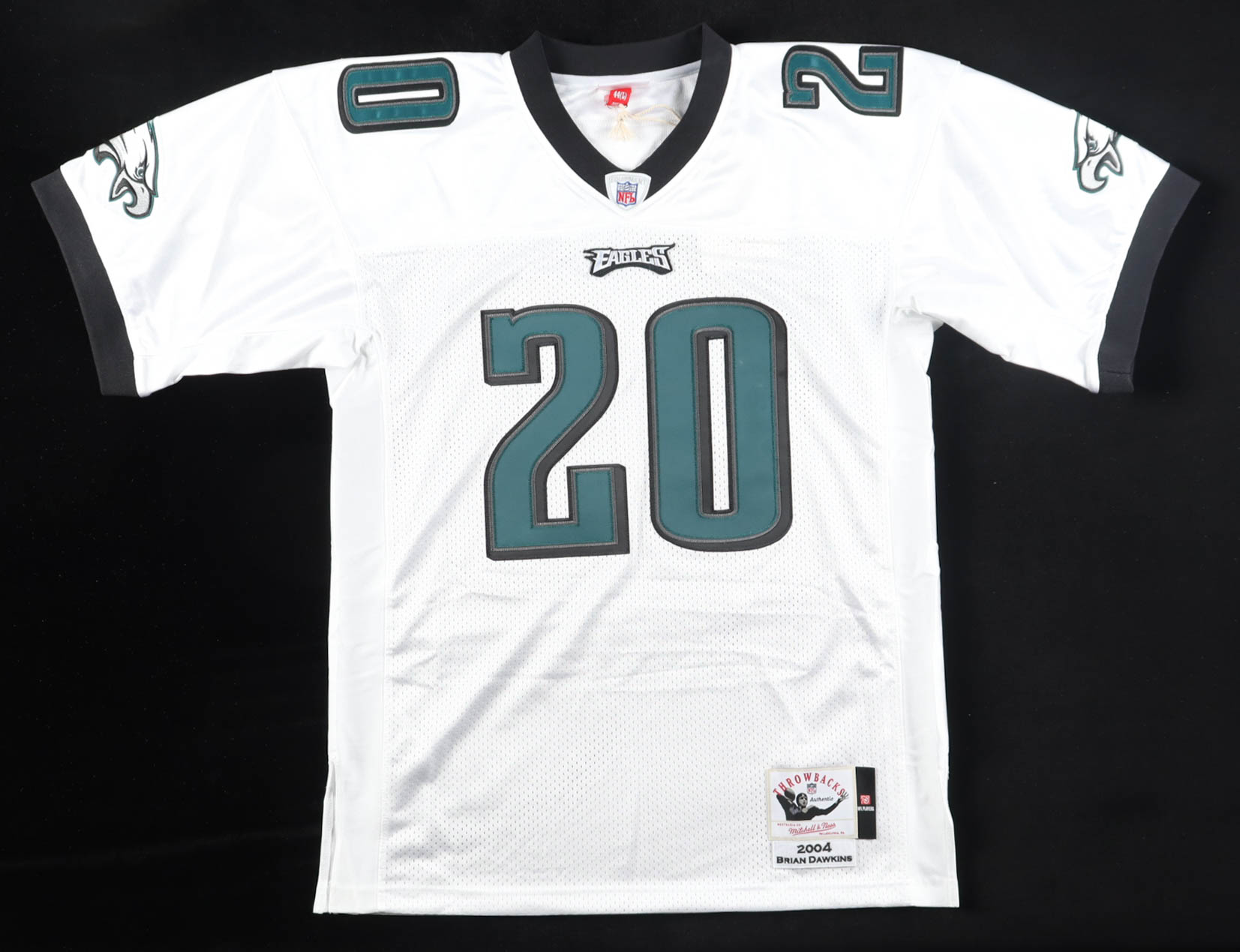 Mitchell & Ness jersey with everything sewn on, size 44 (L). Hand-signed and inscribed by Brian Dawkins (Philadelphia Eagles).