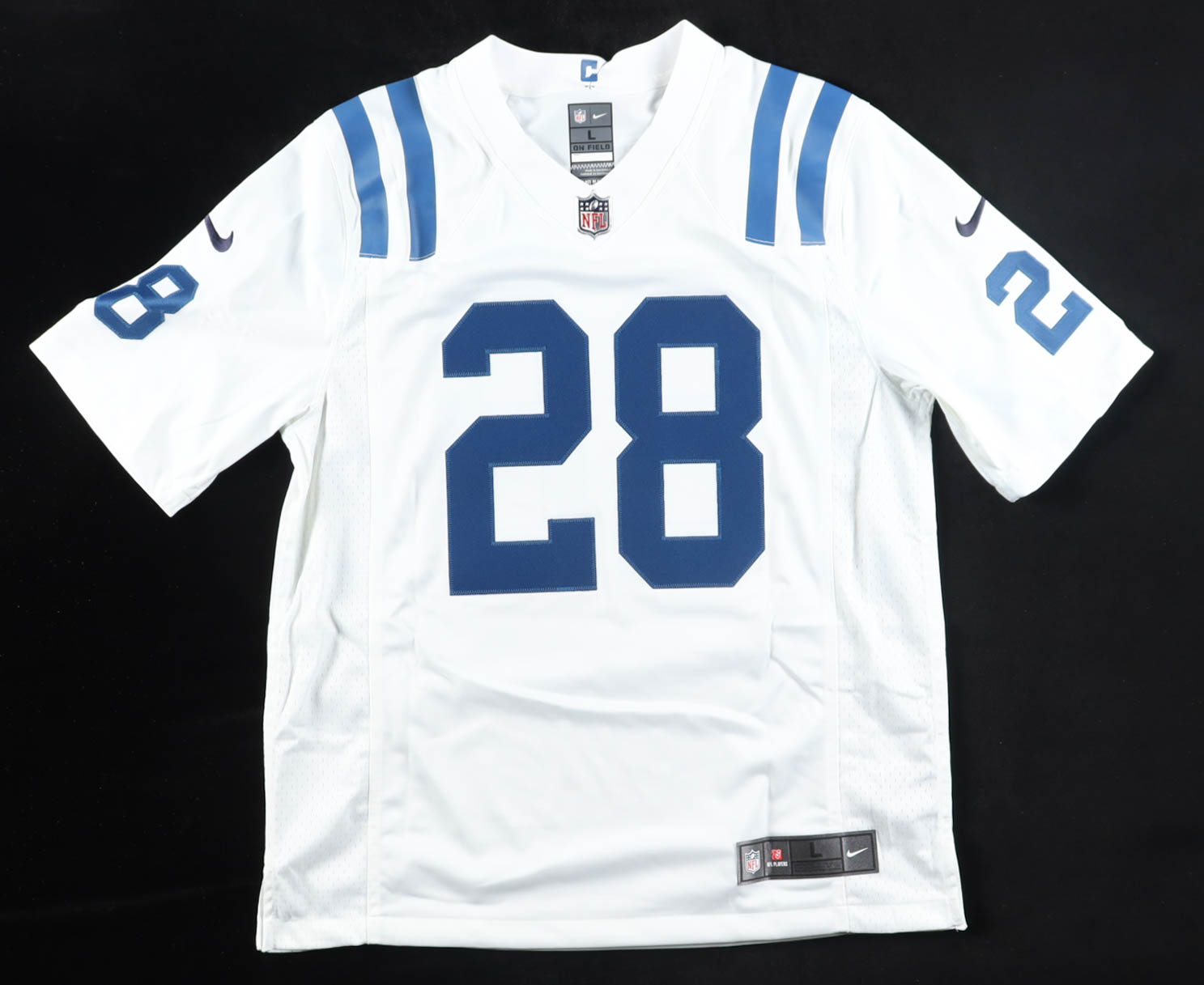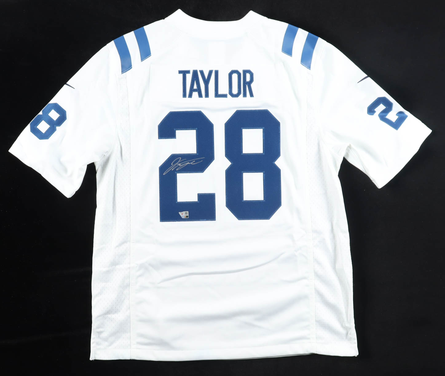 Nike jersey with everything sewn on, size L. Hand-signed by Jonathan Taylor (Indianapolis Colts). Please note, there is blue staining throughout the jersey.