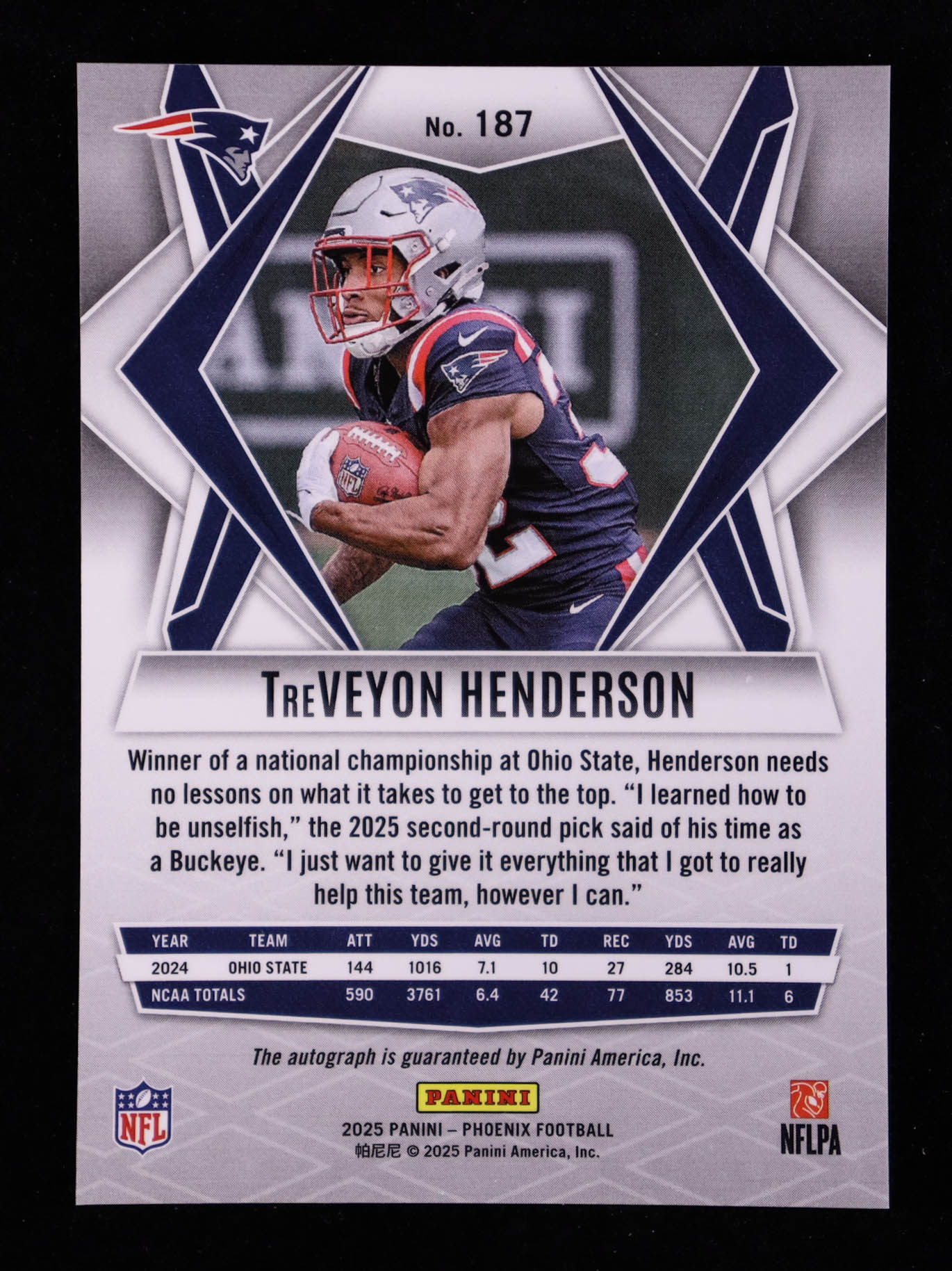 TreVeyon Henderson 2025 Panini Phoenix Rookie Autographs Lazer #187 RC