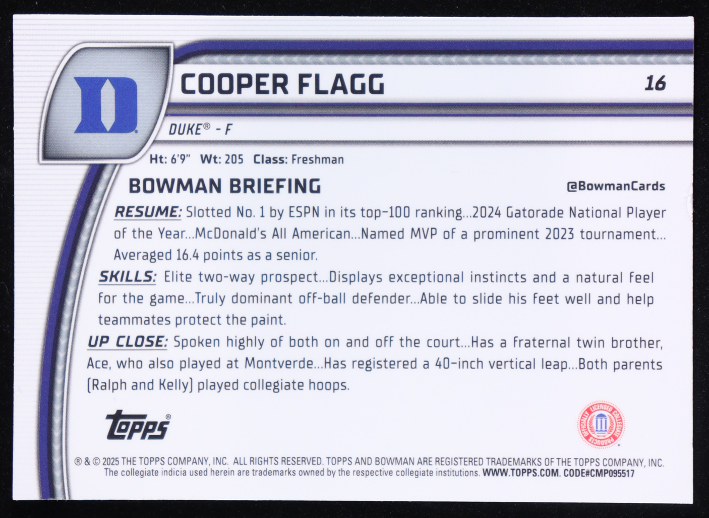 Cooper Flagg 2024-25 Bowman Chrome University Purple Lava Refractors #16 RC