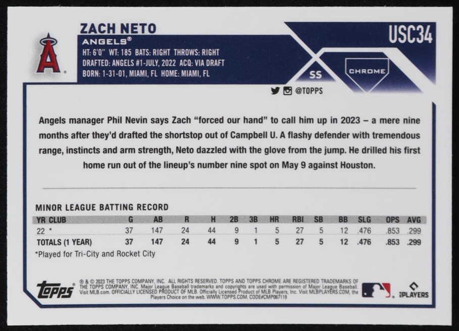 Zach Neto 2023 Topps Chrome Update Pink Refractors #USC34 RC