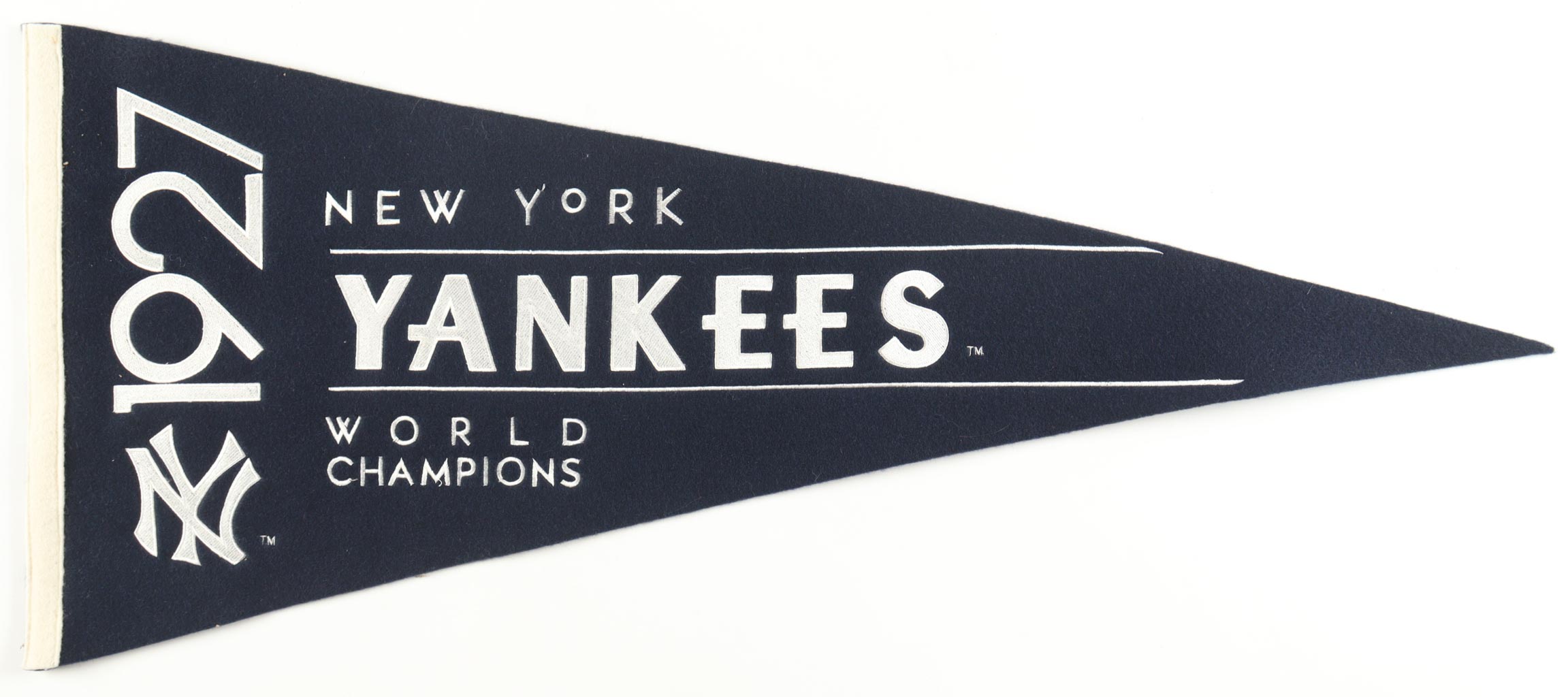 New York Yankees World Champions commemorative pennant flag measures 29" long. Please see photo for more details regarding the condition of the flag. Please note, the item is unsigned.
