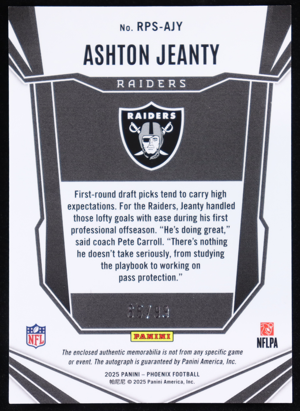 Ashton Jeanty 2025 Panini Phoenix Rookie Phenoms Jersey Autographs Red #20 #65/99 RC