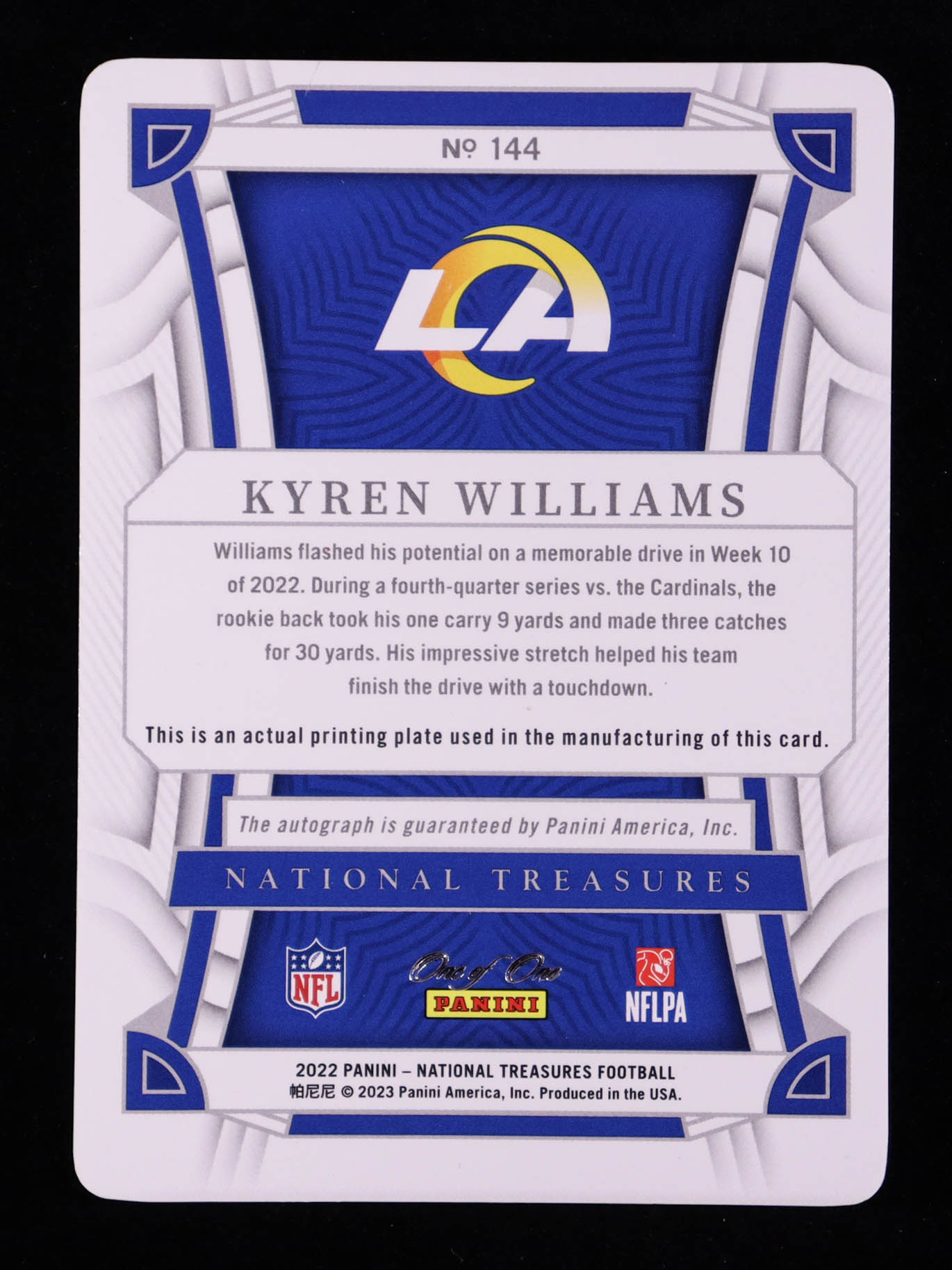 Kyren Williams 2022 Panini National Treasures Printing Plates Yellow #144 Autograph #1/1
