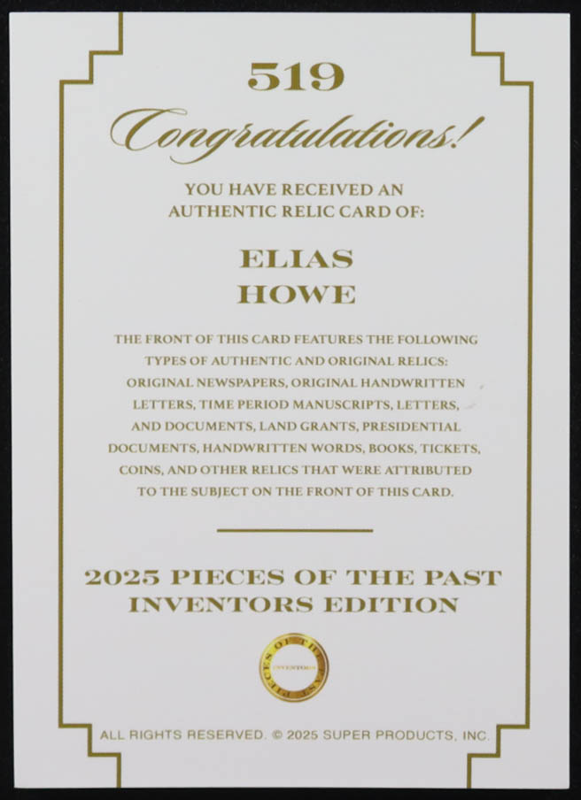 Elias Howe 2025 Pieces of Past Inventors Edition Relic #519