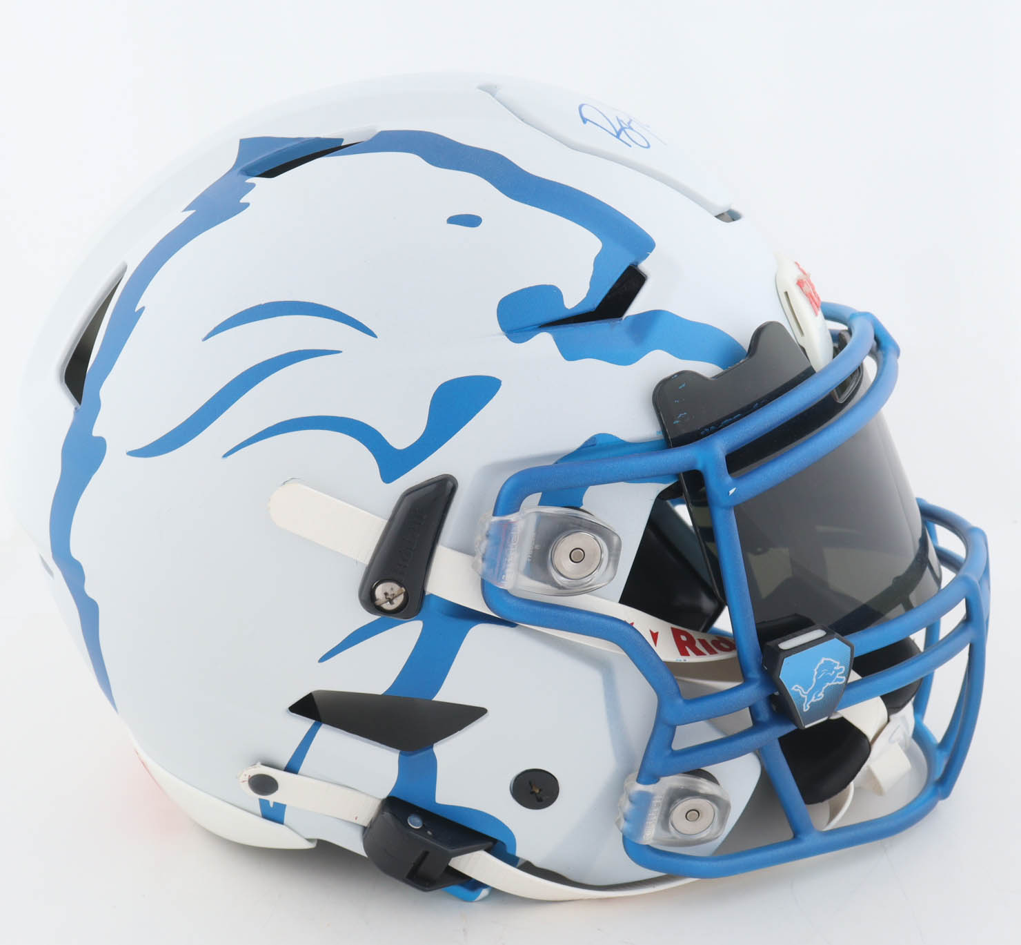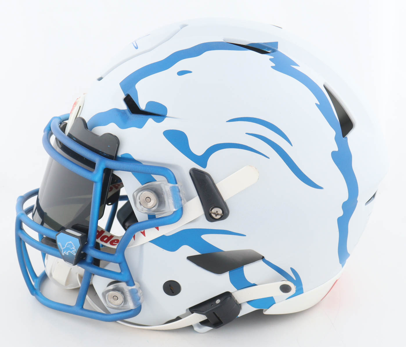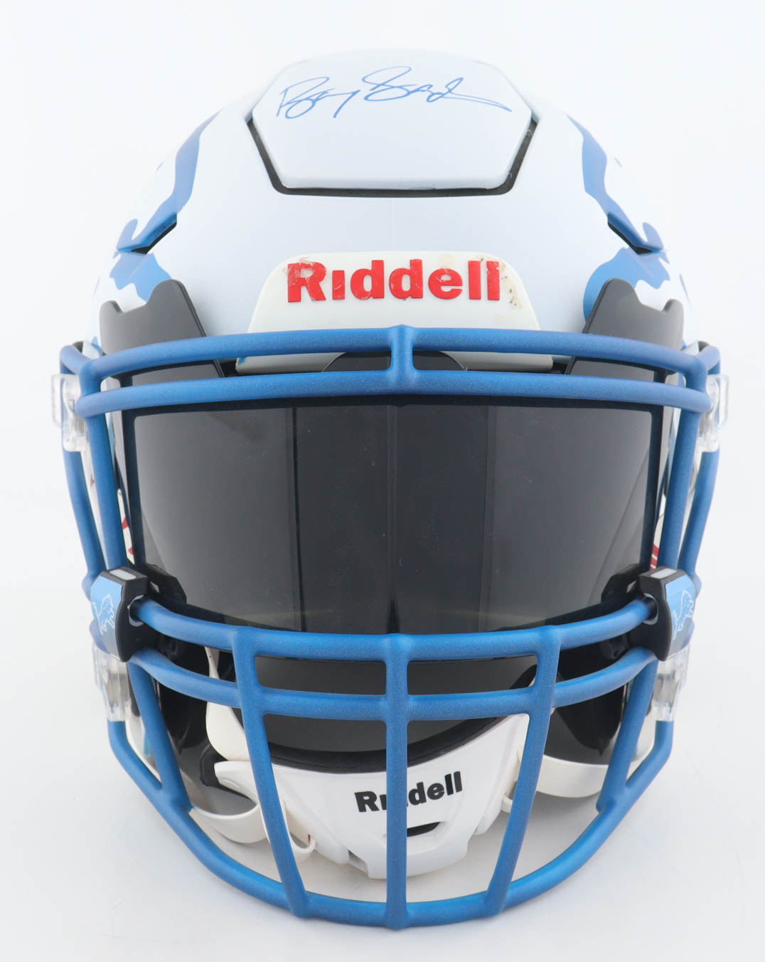 Riddell Detroit Lions full-size authentic on-field custom speed-flex helmet. Has been hand-signed by Barry Sanders (HOF). Please note there is residue on the front Riddell logo plate as well as a stain on the back of the helmet.