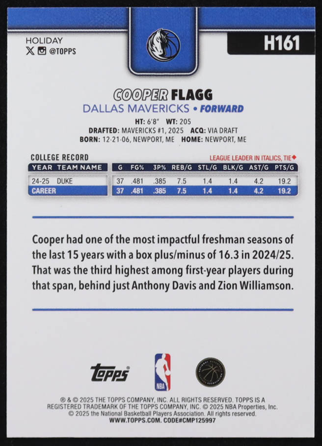 Cooper Flagg 2025-26 Topps Holiday #H161 RC