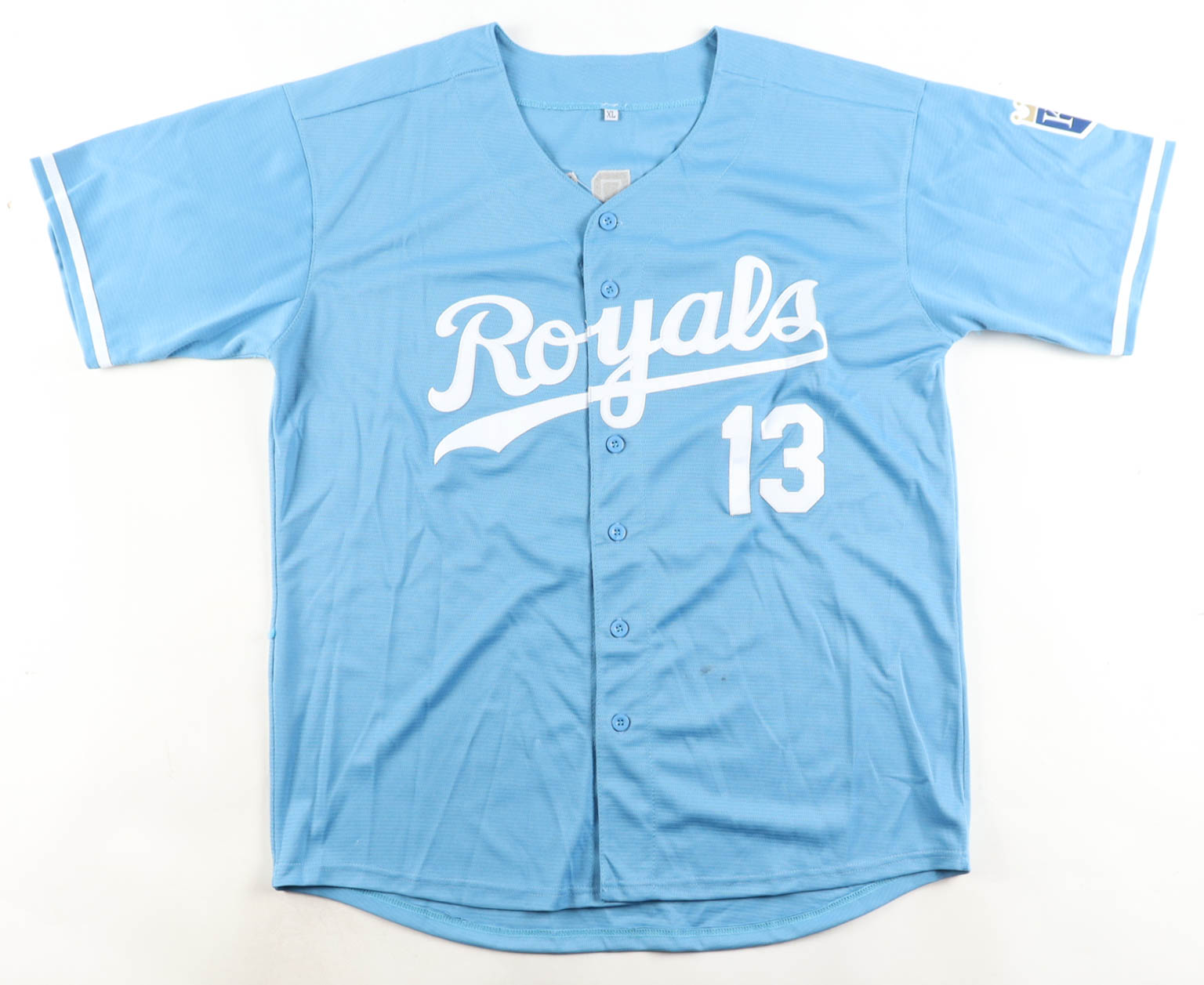 Custom jersey with everything sewn on, size XL. Hand-signed by Salvador Perez.