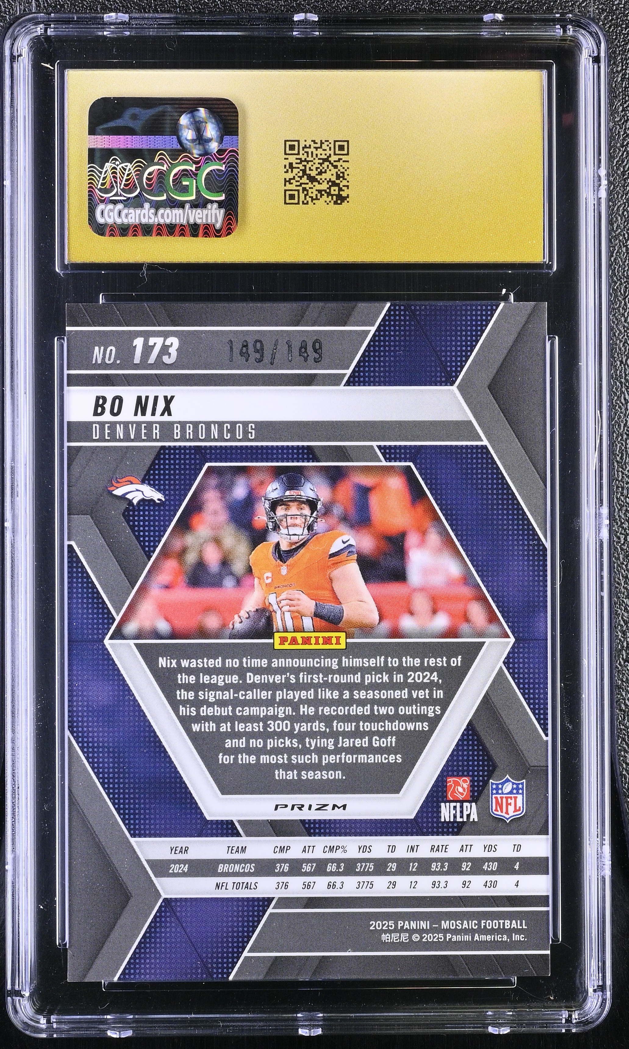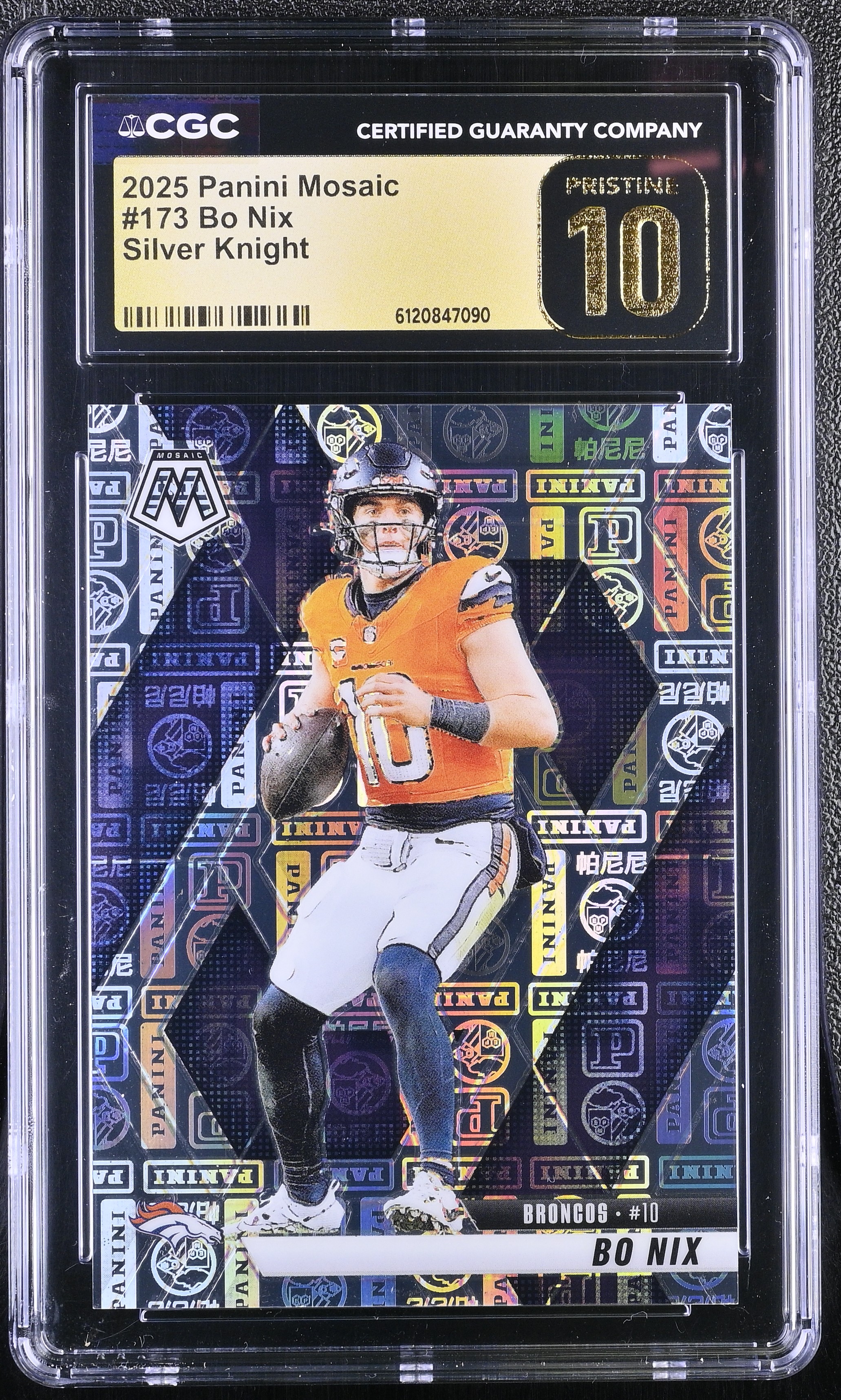 Bo Nix 2025 Panini Mosaic Silver Knight #173 #149/149 (CGC 10 | Black Label)