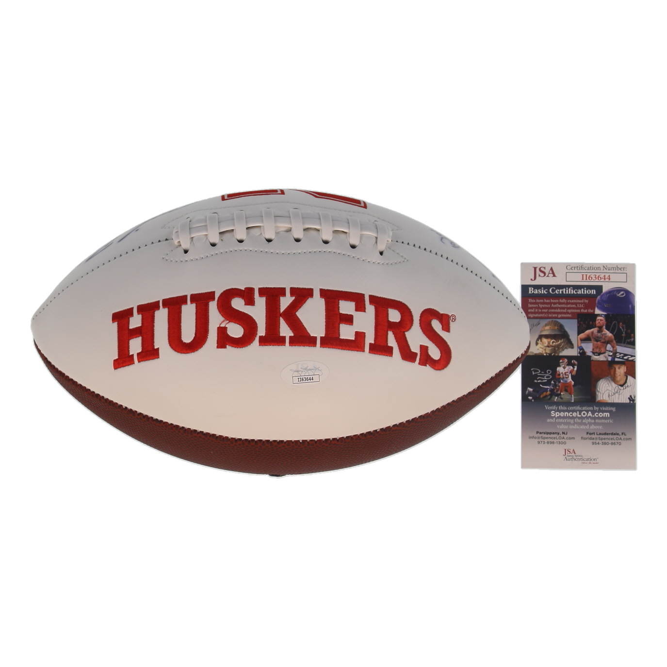 Nebraska Cornhuskers Logo Football. Hand-signed by Irving Fryar, Mike Rozier and Turner Gill. Please note, the signatures have bled and there are minor stains throughout the football.