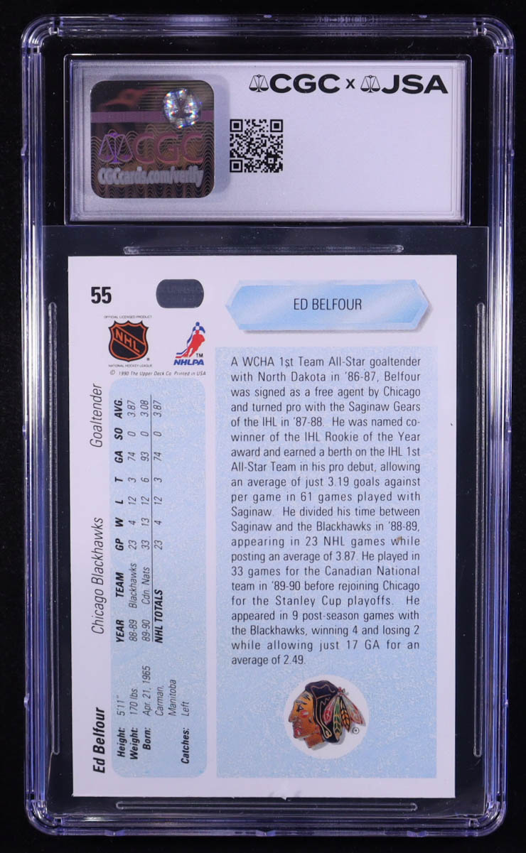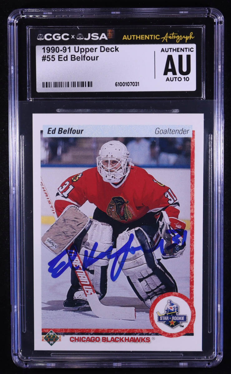 Ed Belfour Signed 1990-91 Upper Deck #55 RC (CGC x JSA | Autograph Graded 10)