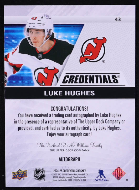 Luke Hughes 2024-25 Upper Deck Credentials Autographs #43