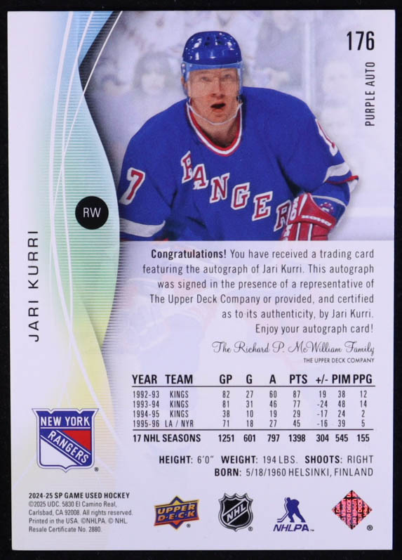Jari Kurri 2024-25 SP Game Used Purple Autographs #176 #4/5
