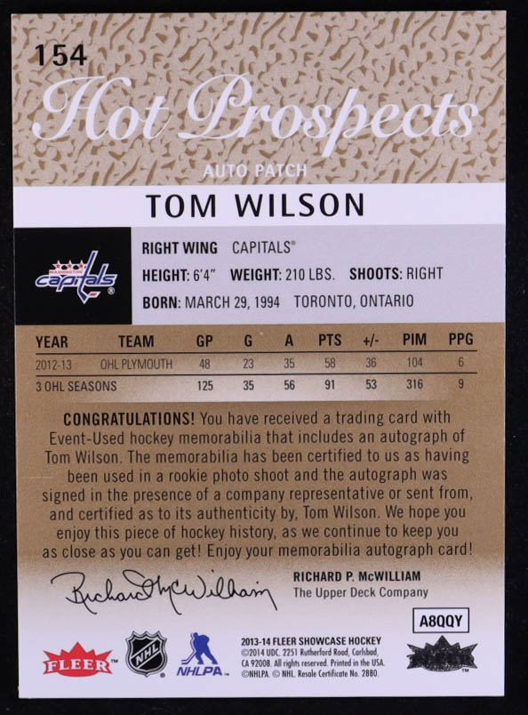Tom Wilson 2013-14 Fleer Showcase Jsy Autographs #154 #101/375 RC