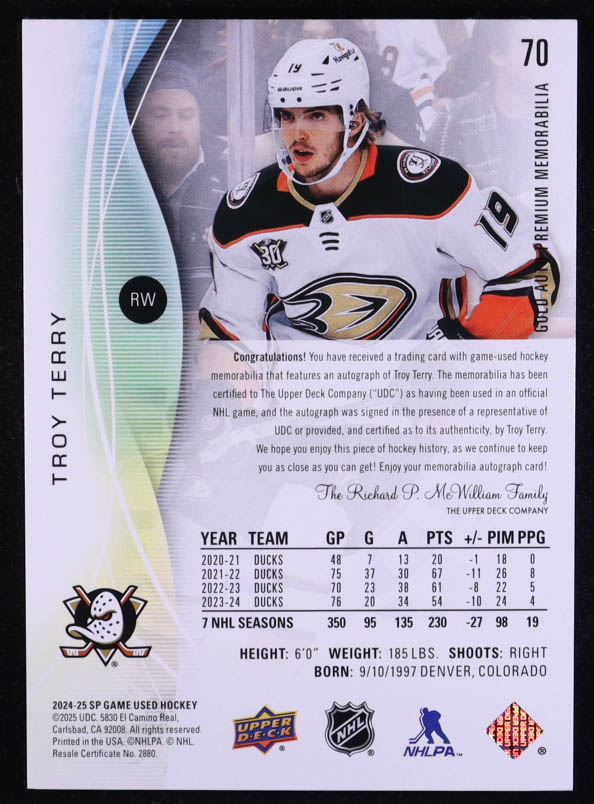 Troy Terry 2024-25 SP Game Used Jersey Autographs Premium Memorabilia Gold Game-Used #70 #12/15