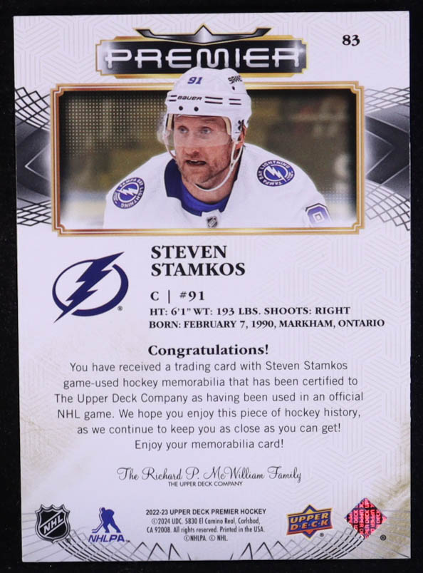 Steven Stamkos 2022-23 Upper Deck Premier Jerseys Premium Memorabilia Game-Used #83 #08/10