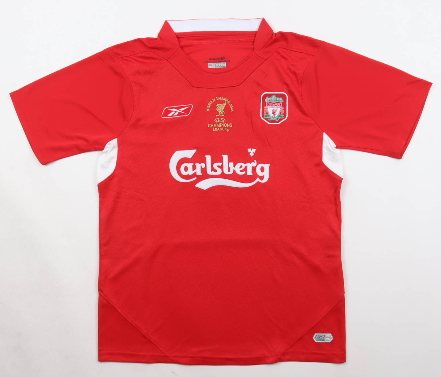 Reebok authentic jersey with everything pressed and sewn on, size L. Hand-signed by Steven Gerrard (Liverpool F.C.).