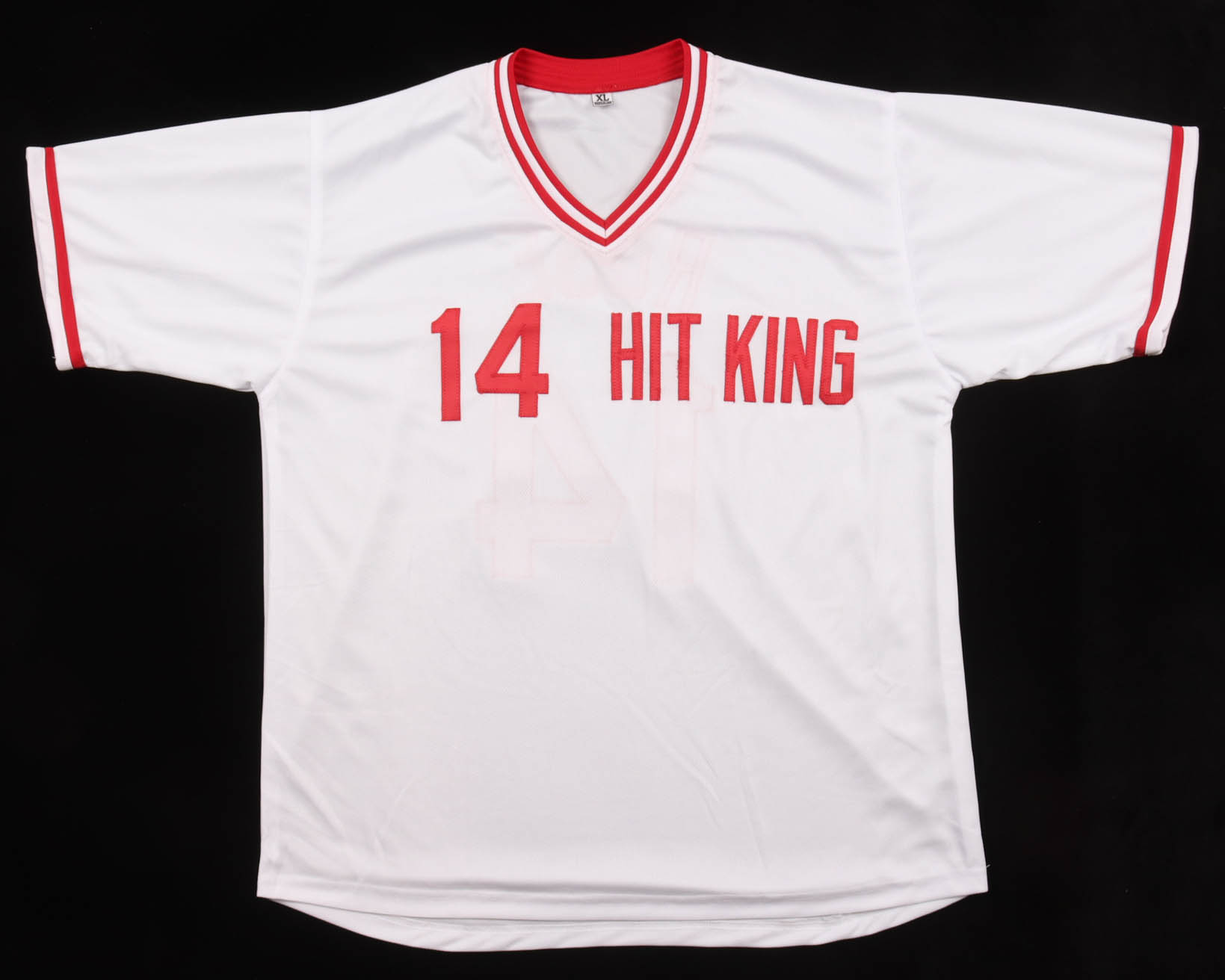 Custom jersey with everything sewn on, size XL. Hand-signed by Pete Rose (D. 2024).
