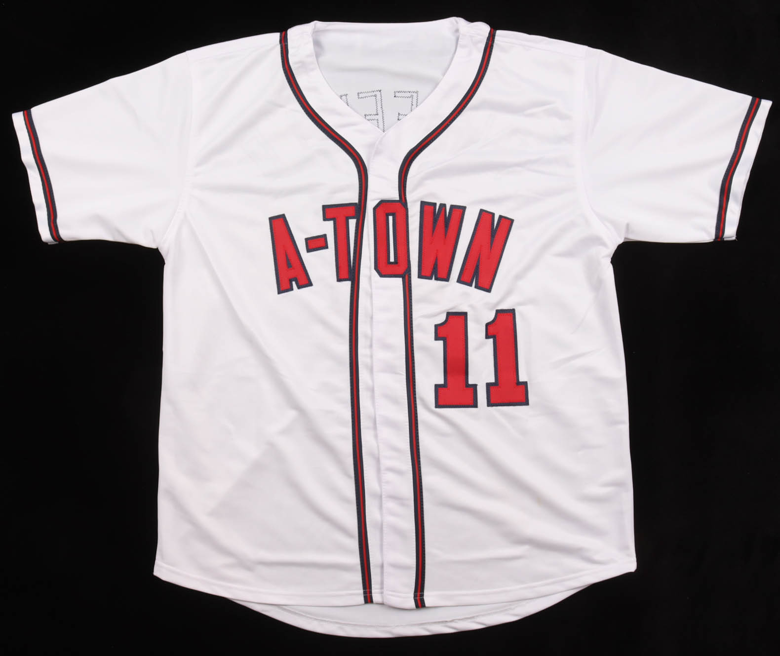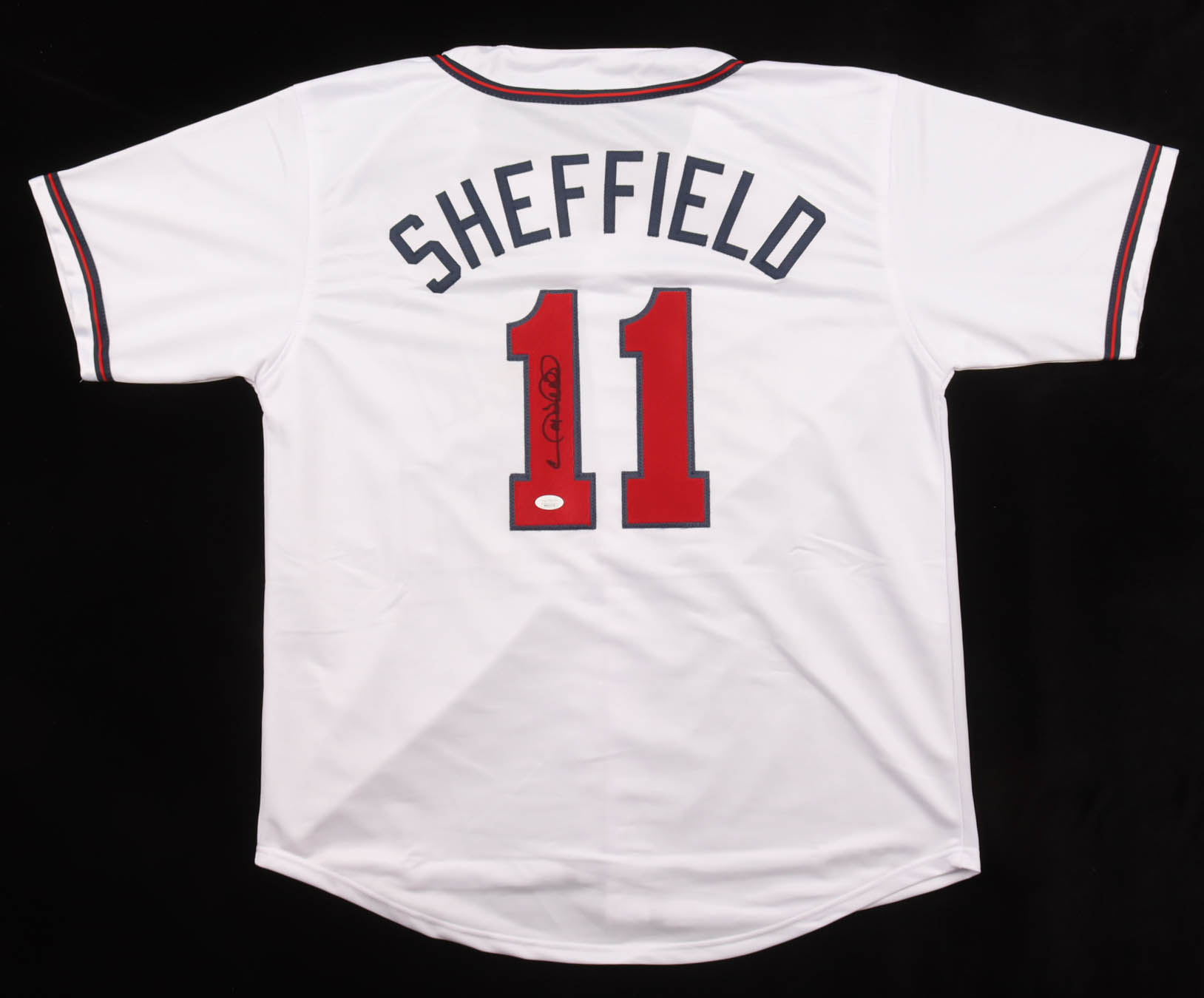 Custom jersey with everything sewn on, size XL. Hand-signed by Gary Sheffield (Atlanta Braves). Please note, the jersey is lightly stained throughout.